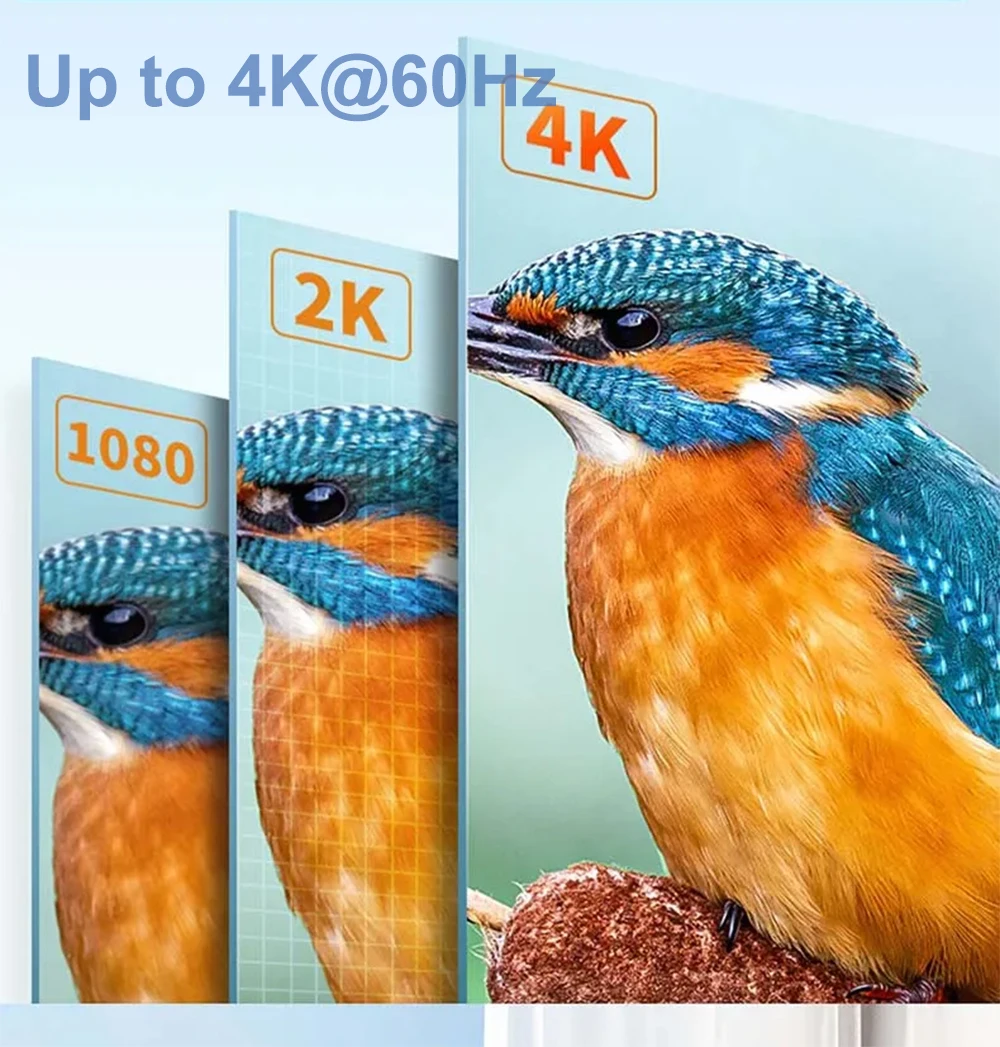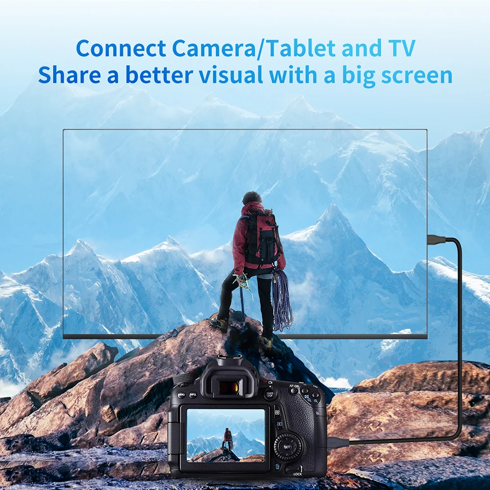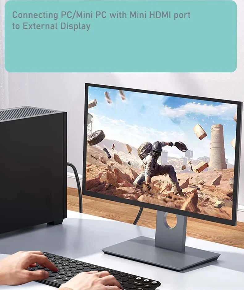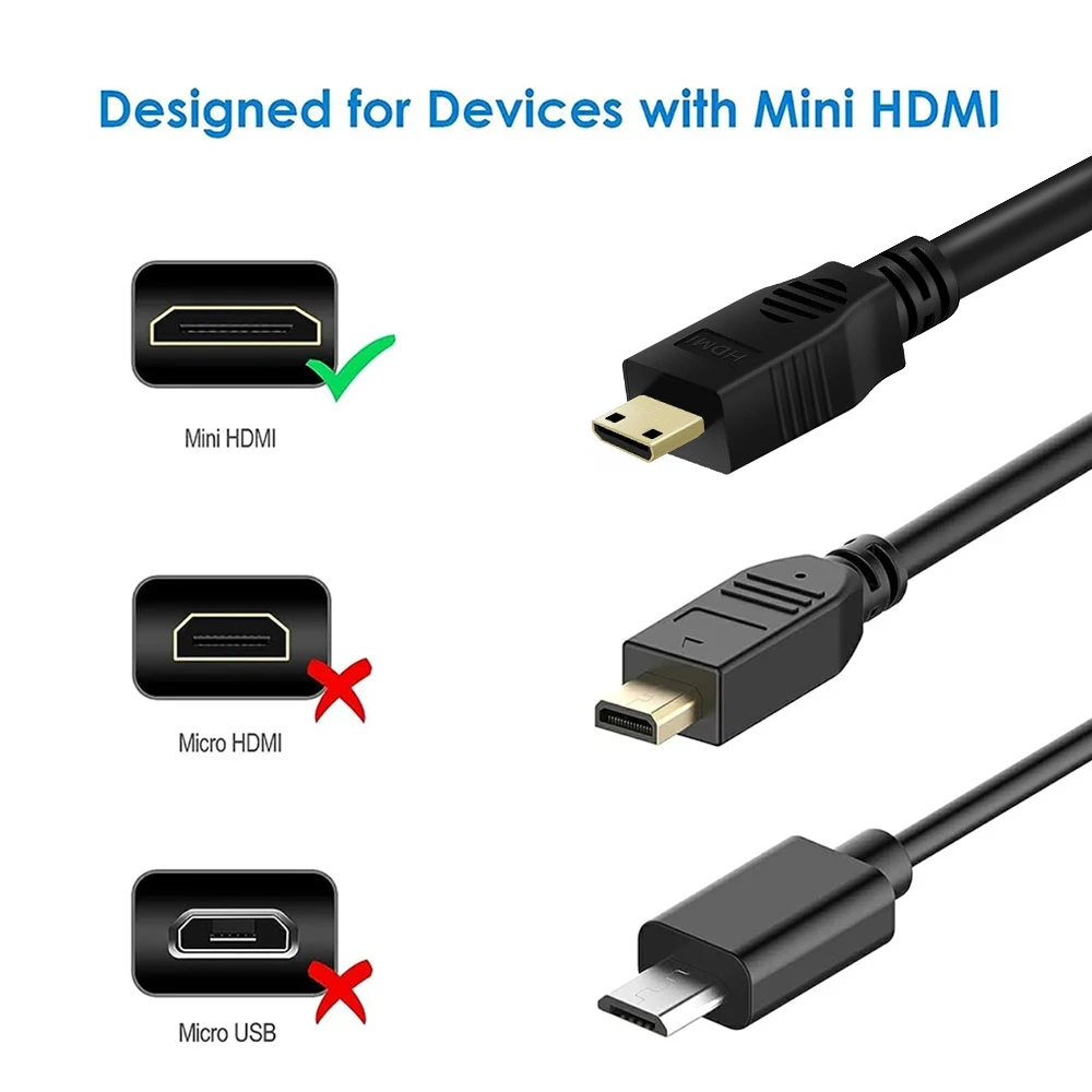 1) El cable que aparece arriba viene con un conector macho Mini HDMI y un conector macho HDMI A.Asegúrese de que sus dispositivos vienen con un puerto Mini HDMI que no es compatible con USB-C, Micro USB, Micro HDMI y otros puertos de video.
