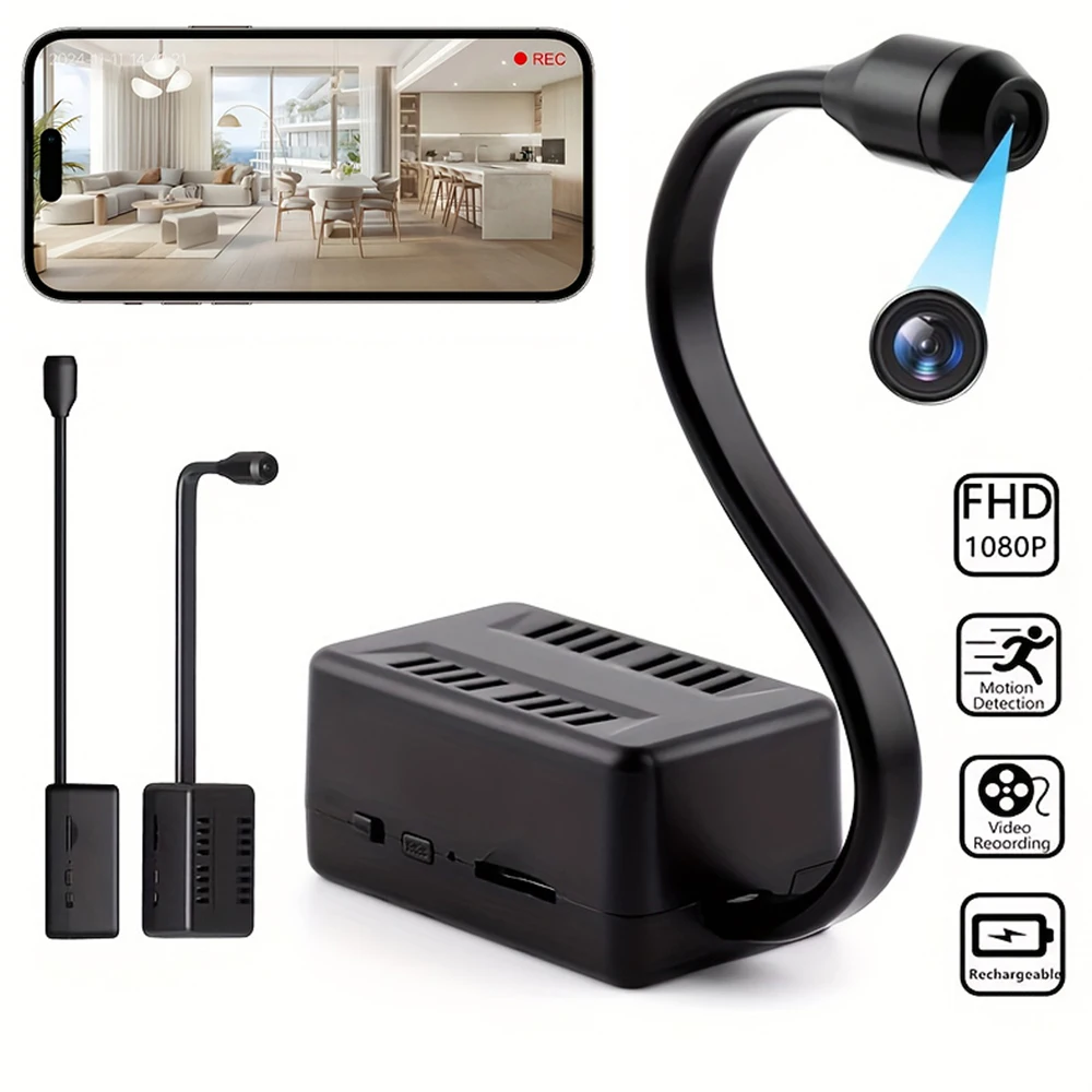 1.Mini cámara 1080P: esta pequeña cámara está equipada con una lente gran angular y un cable de lente ajustable, lo que la hace de diseño flexible.