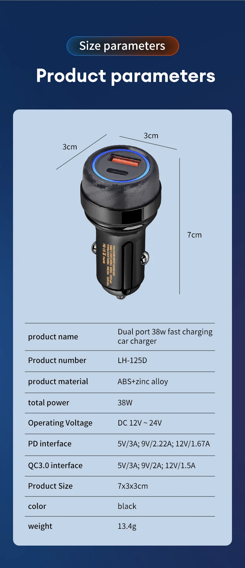 🌹Nombre del producto: Cargador de coche de carga rápida de doble puerto 38W
