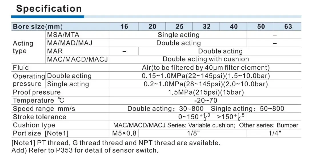 Mini cilindro de aire serie MA40, mini cilindros redondos de doble acción con carrera de 25-500mm MA40x50S-CA-U-CM