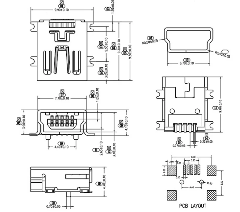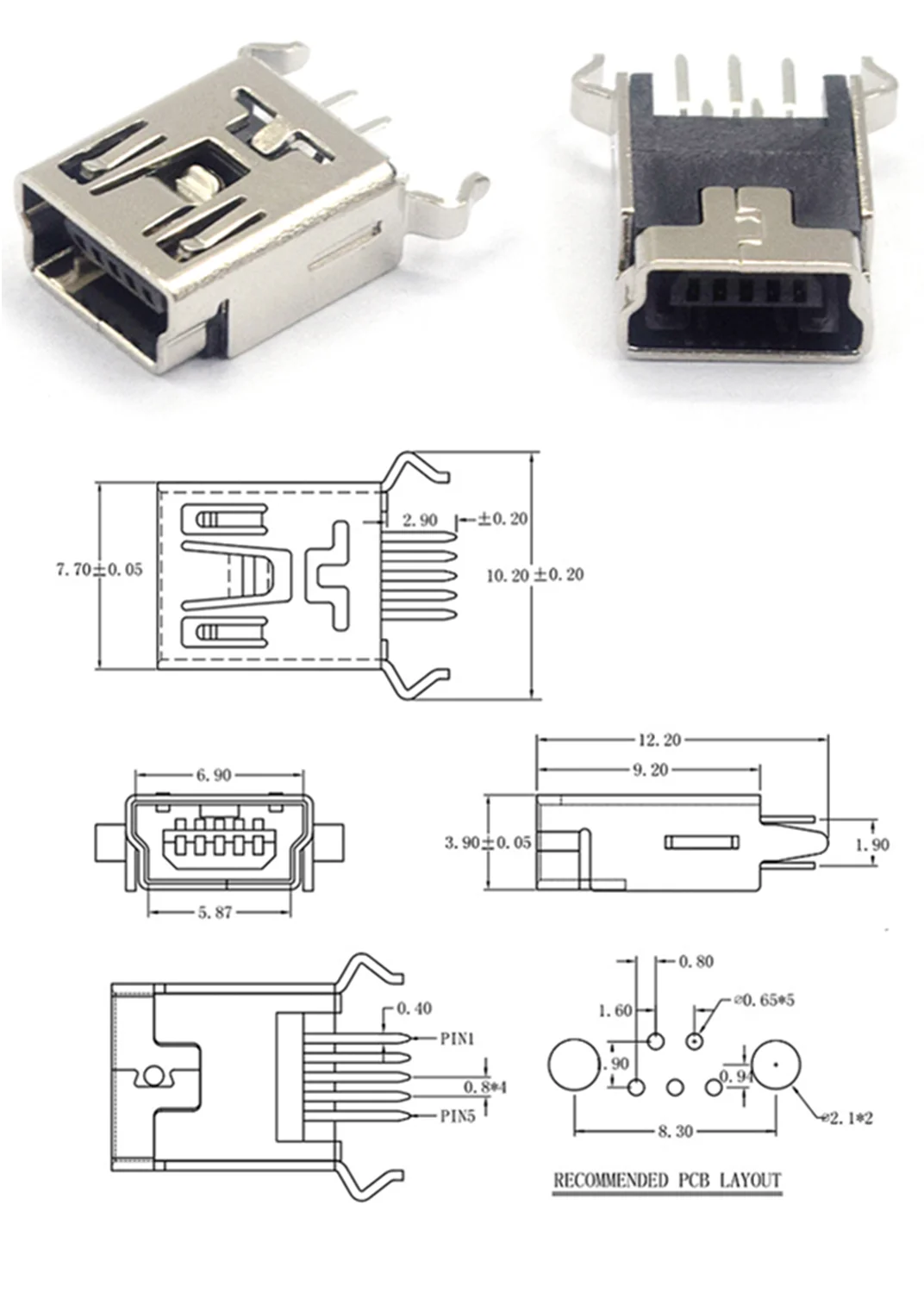 Comprar Mini conector USB tipo B, conector hembra de 5 pines, Vertical/Horizontal, para carga trasera, 100 Uds.
