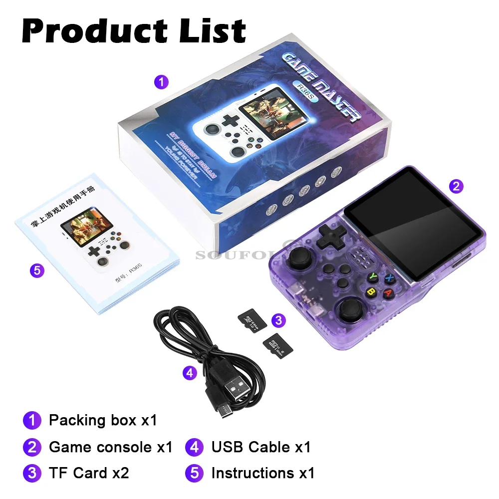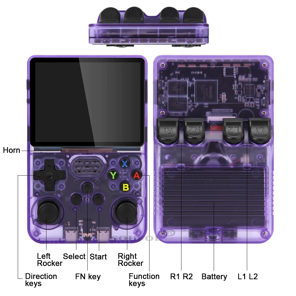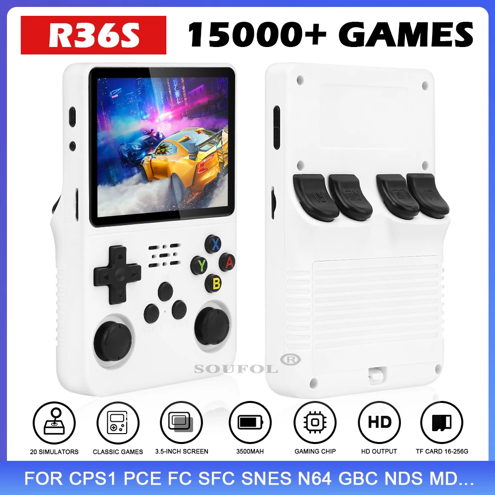 Mini consola de juegos portátil Retro R36S, pantalla IPS HD de 3,5 pulgadas, regalo para niños, sistema Linux, emulador de juegos clásicoCaracterísticas:1. La consola de videojuegos portátil retro R36S de código abierto actualizada, ¡la mejor experiencia de juego para gamerson-the-go!2. Con una pantalla grande de 3,5 pulgadas y capacidad de almacenamiento de 64GB, este reproductor de juegos portátil es el dispositivo perfecto para el entretenimiento en la carretera.3. La pantalla IPS no solo garantiza que la calidad de la imagen sea excepcional, sino que también proporciona un amplio ángulo de visión. 4. ¡El sistema Linux garantiza un rendimiento de juego fluido y permite una fácil personalización!..., La parte posterior de las teclas L/R de cuatro placas de resorte real. Combinado con una delicada curvatura y un diseño artesanal de agarre.