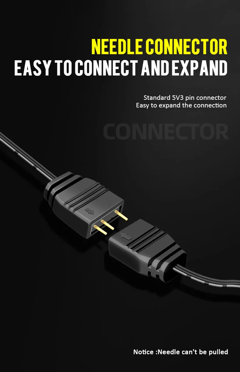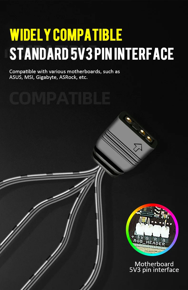 Amplia compatibilidad. La interfaz estándar 5V ARGB es compatible con varios productos emisores de luz con la interfaz estándar universal 5V 3-pin A RGB en el mercado, por lo que no hay necesidad de preocuparse por problemas de compatibilidad.