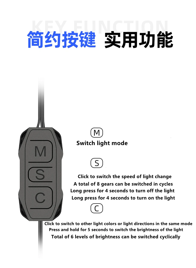 Diseño de botón simple, operación simple y función práctica. (Tecla M haga clic para cambiar al siguiente modo de luz, puede cambiar el modo de luz del propio controlador; tecla S para hacer clic para cambiar la velocidad de cambio de luz, se pueden activar un total de 8 marchas; mantenga pulsada la tecla S durante 4 segundos para apagar la luz, Y luego presione durante 4 segundos para encender la luz; haga clic en la tecla C para cambiar a otros colores de luz bajo el mismo estilo o invertir la luz, mantenga presionada la tecla C durante 5 segundos para cambiar el brillo de la luz, un total de 6 niveles de brillo se pueden disminuir y ciclar).