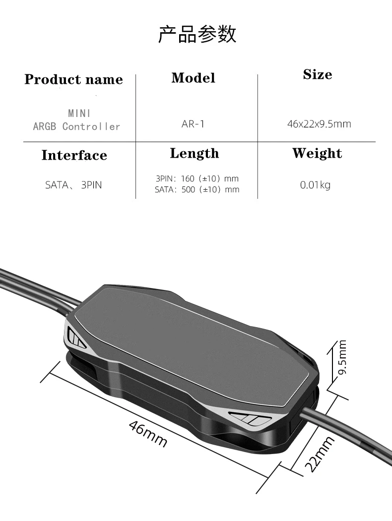 Cumple con los requisitos de la mayoría de chasis para la longitud del cable. La interfaz de 5V y 3 pines adopta un diseño de cable de extensión, que es conveniente para la conexión y no se cae fácilmente, y al mismo tiempo resuelve el problema de la longitud insuficiente del cable. La Longitud del cable de interfaz es de 160 ± 10mm, y la longitud del cable de alimentación es de 500 ± 10mm. (Nota: la interfaz de fuente de alimentación SATA, conectada directamente a la fuente de alimentación del ordenador, no necesita que la placa base admita 5V 3-PIN ARGB para controlar la iluminación de los productos ARGB).
