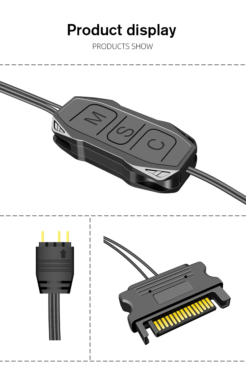 Este controlador es un producto ARGB de 5V y 3 pines para el controlador de fuente de alimentación SATA, no necesita soporte de placa base, conecte directamente la interfaz SATA de la fuente de alimentación para suministrar energía.