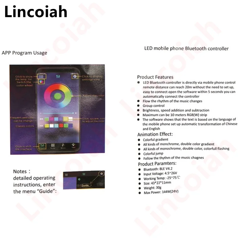 This Lincoiah smart device directly controls the on and off of the light, adjusts the color and brightness of the light and also adjusts various beautiful light effects, such as 1, colorful gradient change, various monochrome, bi-color gradient change, all kinds of monochrome, two-color, colorful strobe, colorful flash and so on.