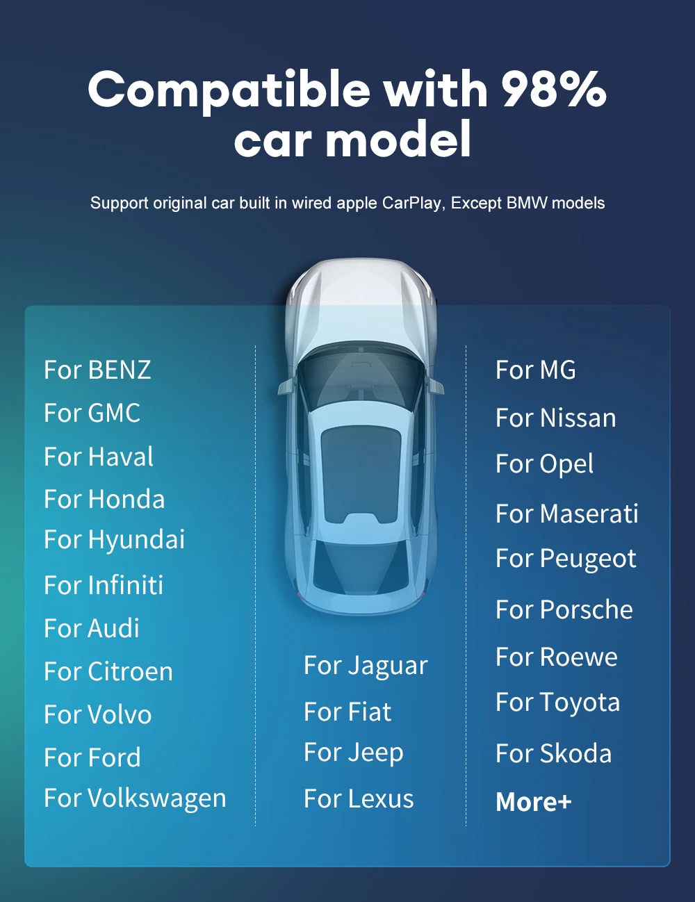 • Compatibilidad con múltiples marcas de automóviles:El Mini Carplay & Auto Box Dongle es compatible con una amplia gama de marcas de automóviles, incluyendo Audi, Toyota, Mazda, Nissan, Chevrolet, Suzuki, Subaru, Kia, Ford, Opel, Skoda, Y Hyundai.