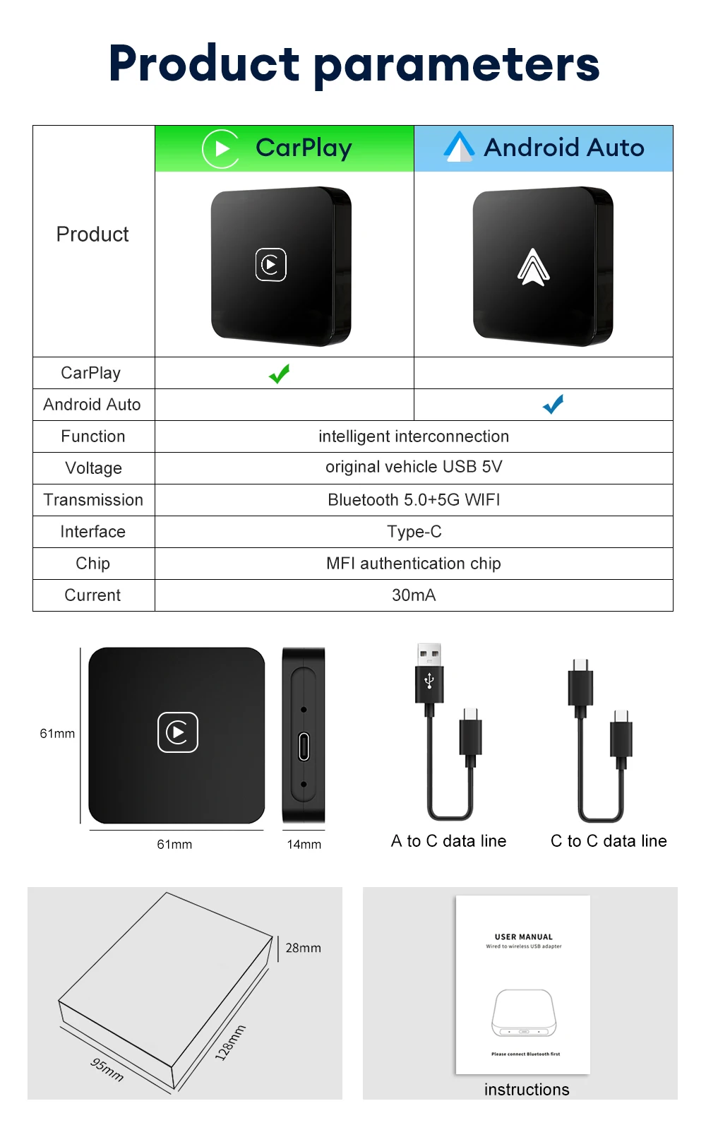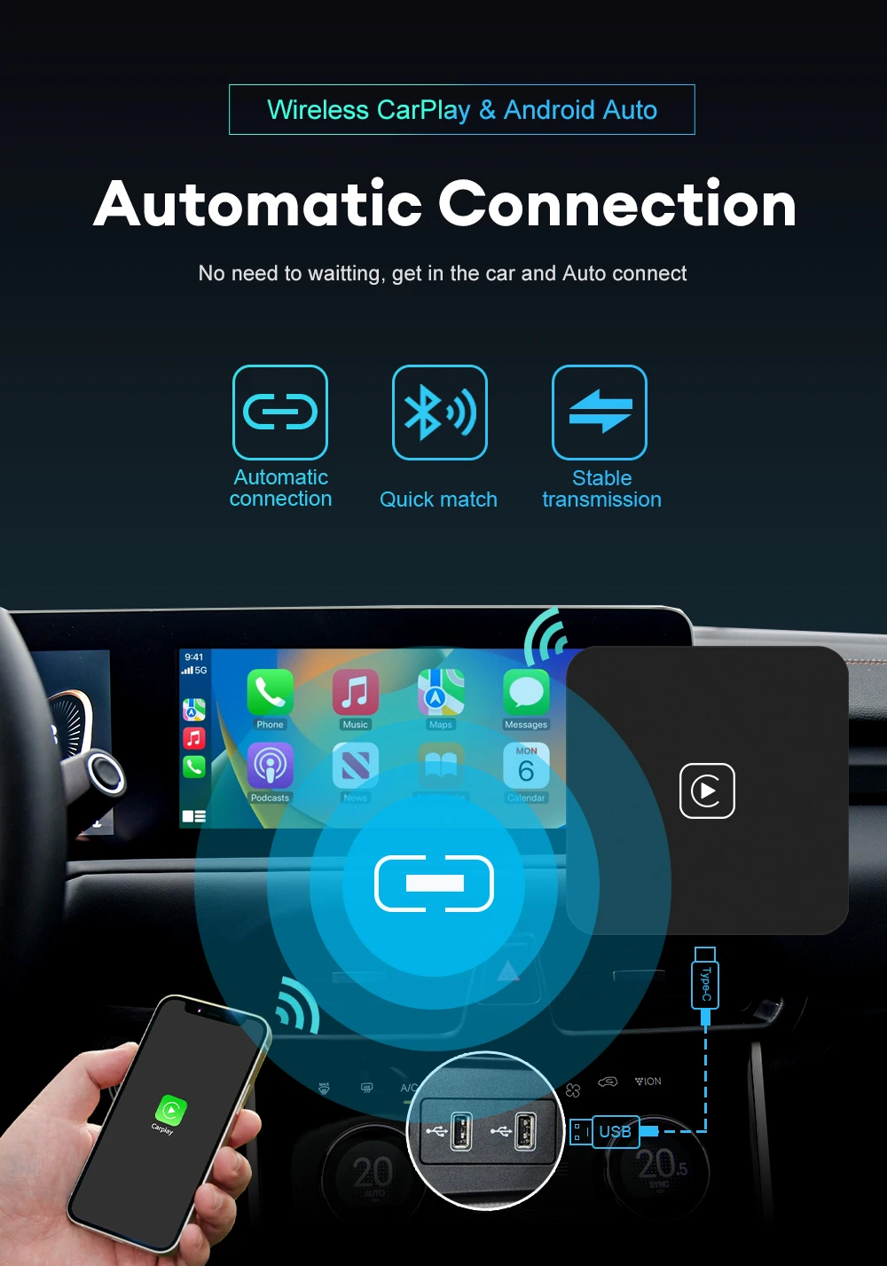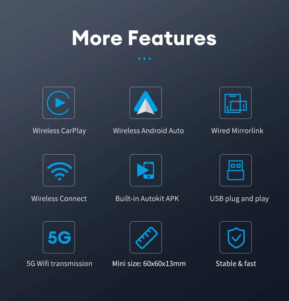 • Conectividad alámbrica a inalámbrica:Disfruta de la libertad de la conectividad inalámbrica mientras sigues pudiendo usar el puerto de carga de tu teléfono con el Mini Carplay & Auto Box Dongle.
