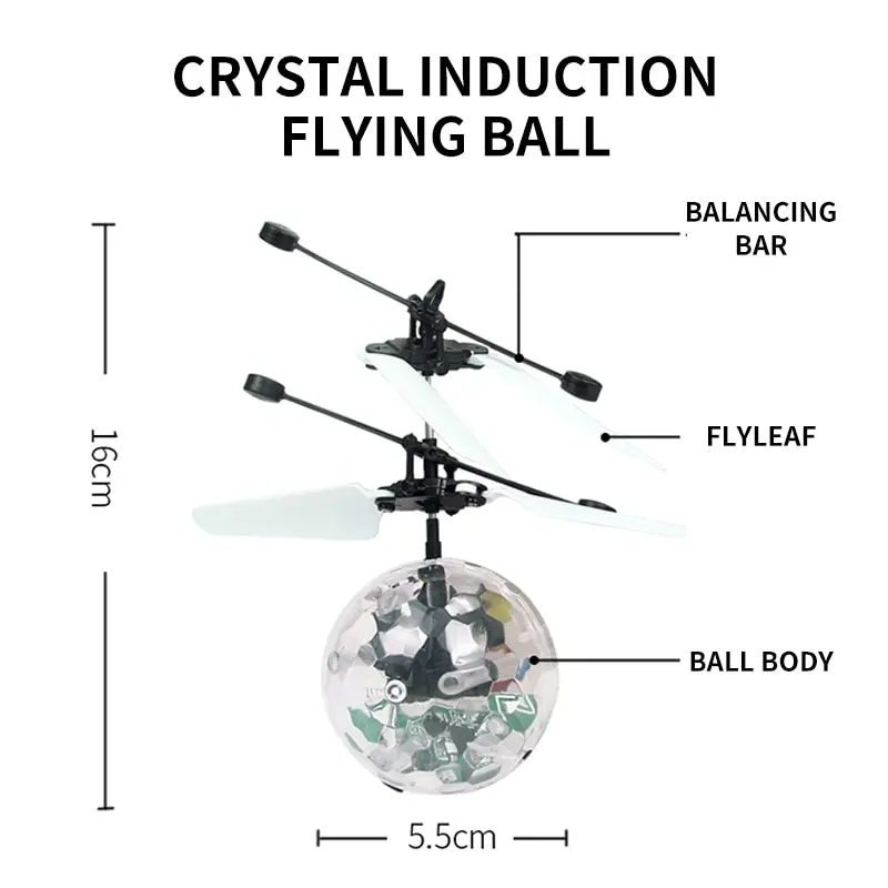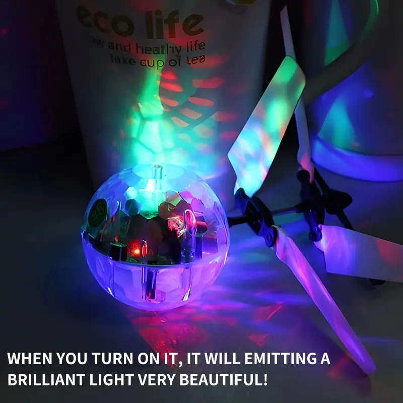 Es como un helicóptero de juguete, pero en lugar de la cabina del helicóptero habitual y el cuerpo que cuenta con una bola de cristal transparente. ¡Cuando lo encienda, emitirá una luz brillante, muy hermosa!