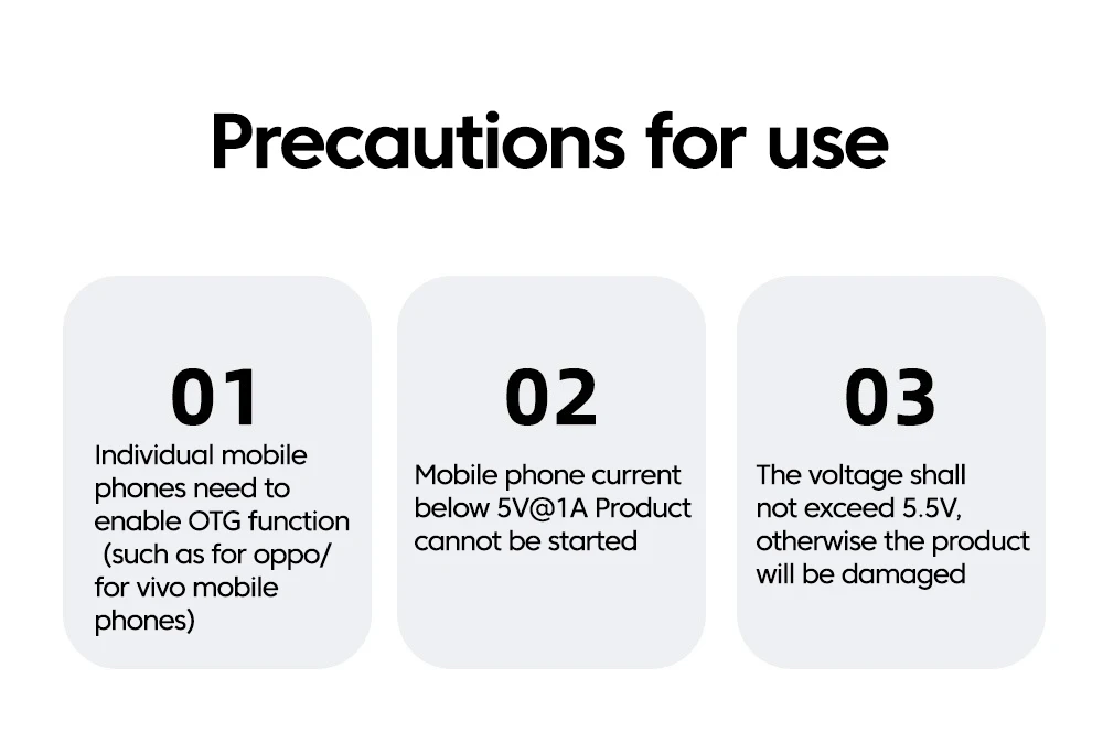 La corriente del teléfono móvil es inferior a 5 V a 1 A. El producto no se puede iniciar y el voltaje no puede exceder los 5,5 V; de lo contrario, dañará el producto.