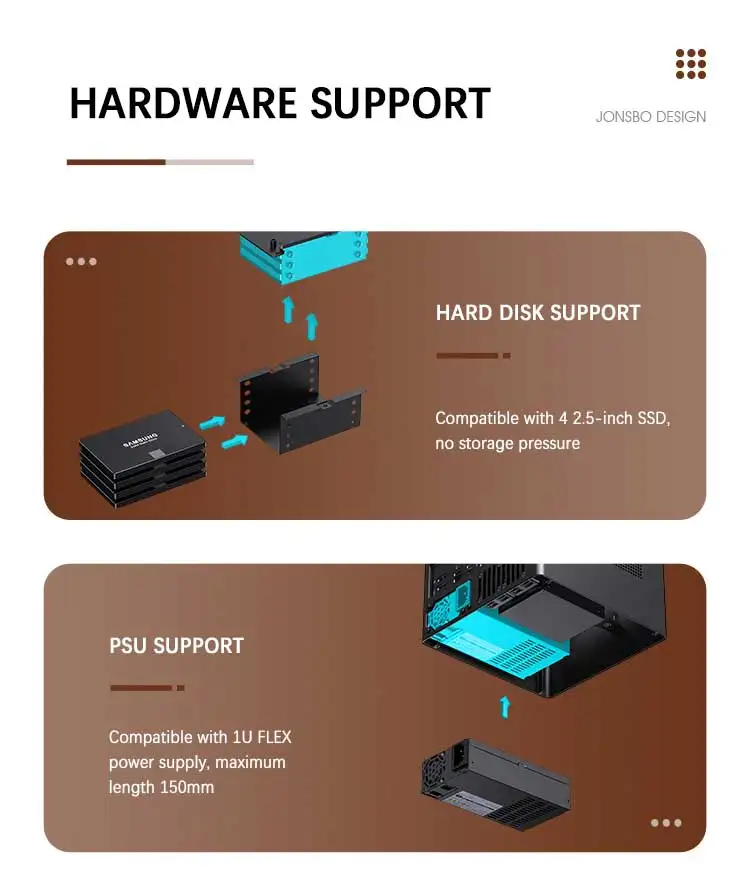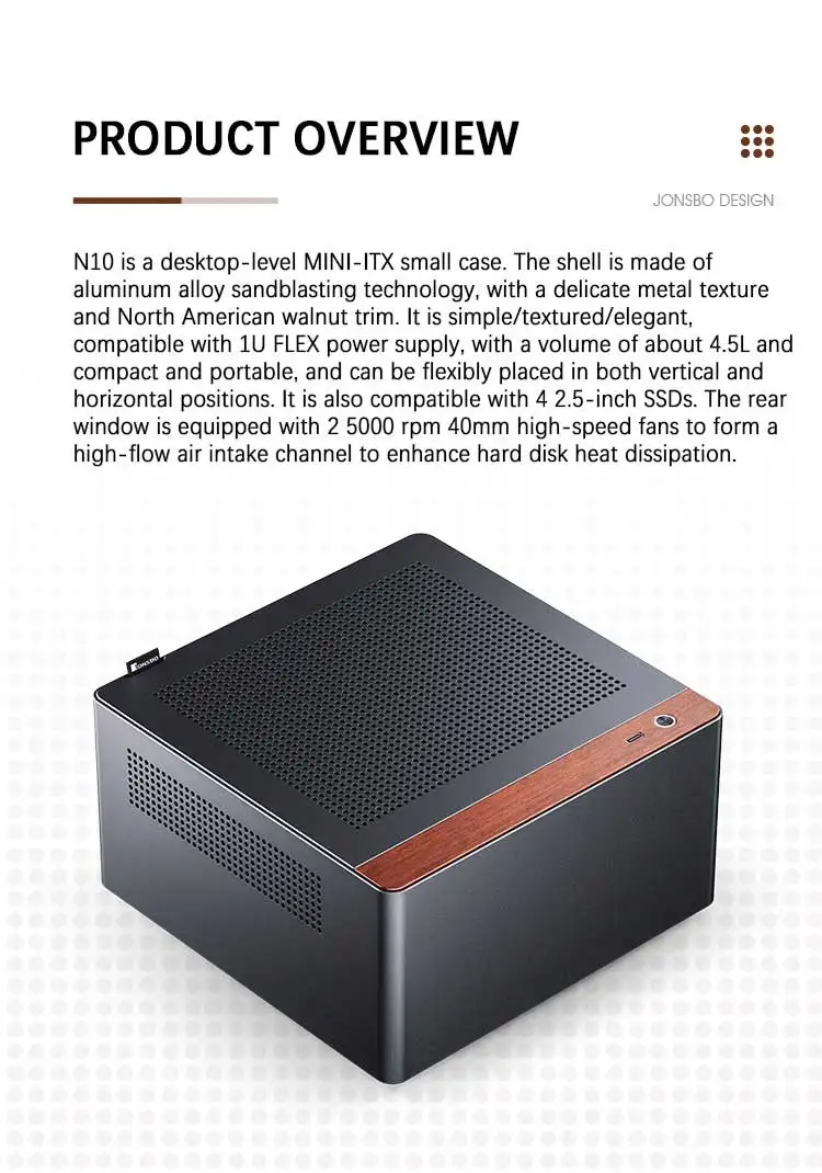 Feliz con la compra. El precio fue muy bueno. La caja en sí tenía un viaje brusco que pareció, pero el caso no estaba dañado. El remitente envió el paquete rápidamente (siguiente día), pero tardó casi un mes exactamente en llegar aquí. (Marco XVIII - 17 de abril), de los cuales la mayor parte del tiempo pasó esperando un vuelo en el aeropuerto. La placa Mini-ITX con enfriador (Noctua NH-L9i) se ajusta sin problemas. Instaló 2 unidades de 2,5" y cambié los ventiladores con 2 Noctua NF A4x20. Se utilizó una fuente de alimentación existente desde el caso anterior que tengo un cable atado al estuche. El estuche se ve bonito, sin problemas de enfriamiento, silencioso y elegante. Puedo nombrar 2 downside: - La fuente de alimentación solo se adapta a FlexATX, que tiene una disponibilidad muy limitada aquí. Ninguno de los modelos está correctamente certificado 80+ Y modular. - El único puerto frontal disponible es un puerto USB-C. Se habría preferido un USB normal para mi caso de uso. Ambos lados de abajo fueron conocidos de antemano, por lo que realmente no puedo quejarse.