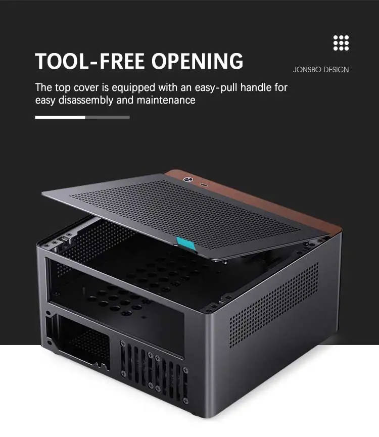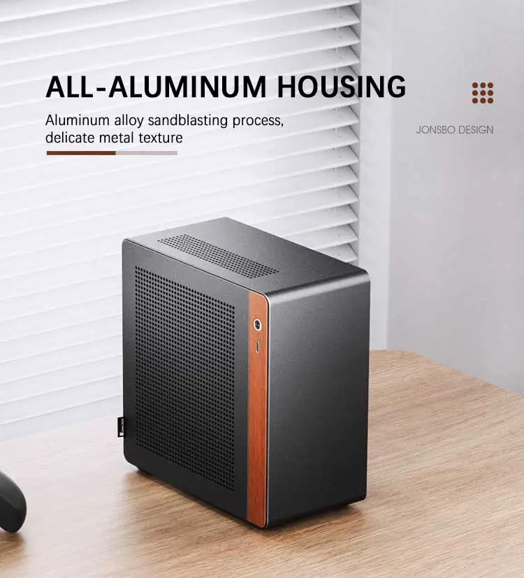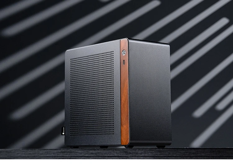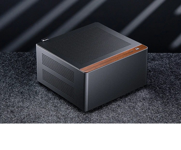 Bonita y de muy buena calidad carcasa para PC SFF ITX. Las piezas metálicas son bastante gruesas, creo que miden entre 1 y 1,5 mm de ancho. ¡Y la parte de madera es una pieza increíble!