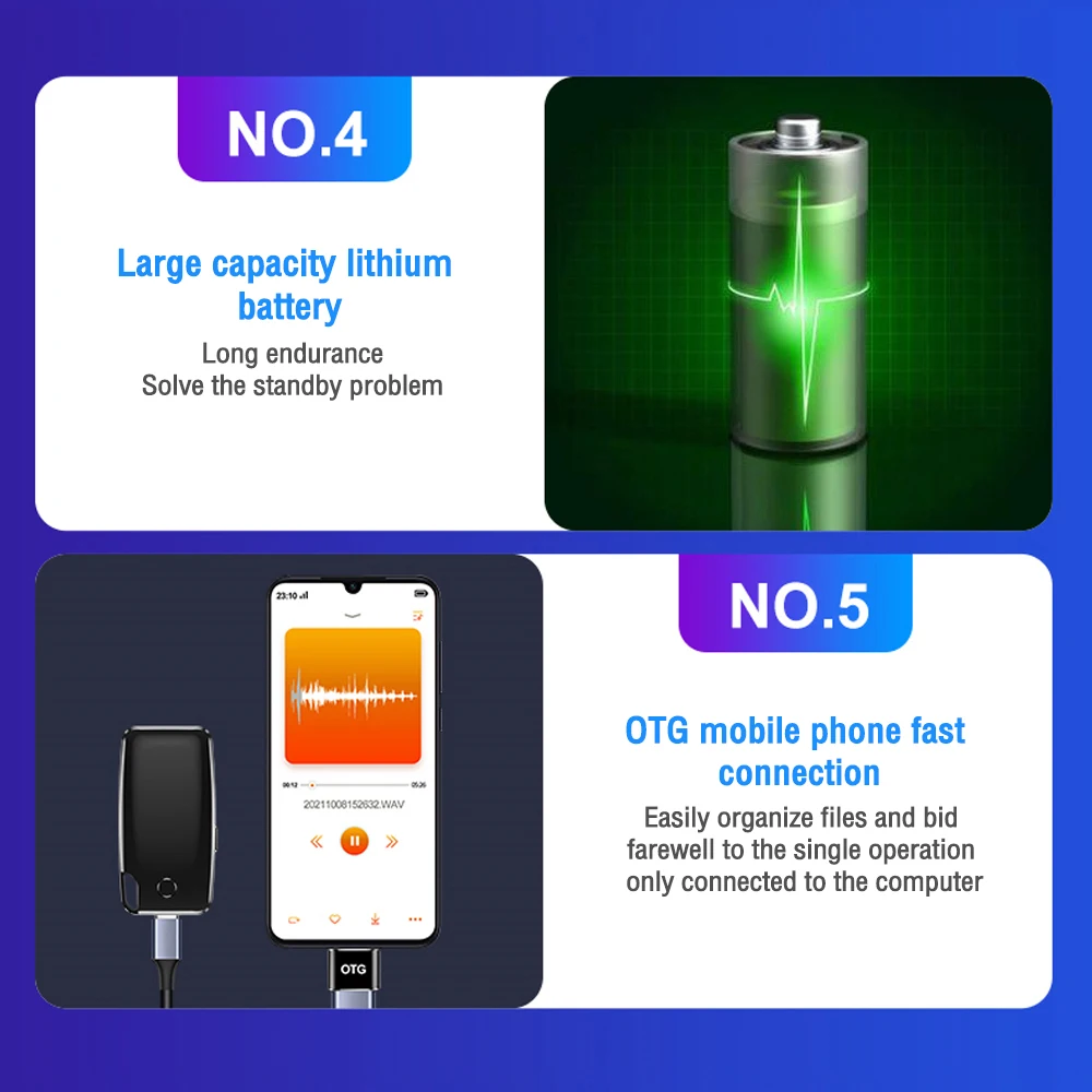 1. La batería de litio de polímero de seguridad de gran capacidad incorporada y el sistema de administración de energía inteligente AI pueden reducir el consumo de energía de grabación, y el tiempo de grabación ultralargo de aproximadamente 50 horas puede satisfacer sus necesidades.
