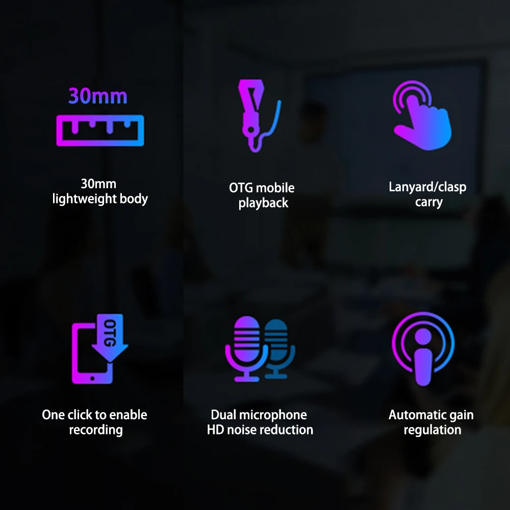 Características:1. [30mm ultra mini] supertamaño y peso, fácil de operar, un clic para comenzar a grabar, un clic para guardar.2. [Equipado con un cordón] Se puede transportar de múltiples maneras y se puede usar como decoración para colgar en mochilas, collares, llaveros, etc., grabando silenciosamente en cualquier momento y en cualquier lugar.3. [Grabación controlada por voz] Grabación de audio, espera silenciosa, ahorra batería y espacio.4. [Reproducción móvil OTG] Carga rápida, compatible con la reproducción OTG móvil de grabaciones, importación de archivos, exportación, etc., lo que hace que sea conveniente ver los archivos de grabación en cualquier momento. (Solo compatible con teléfonos Android)5. [Reducción de ruido de alta definición] Función de cuerpo pequeño, velocidad de reducción de ruido autónoma de doble núcleo integrada, ganancia de ajuste automático de campos de sonido lejanos y cercanos, captación dinámica de Micrófono dual, grabación más clara.Parámetros:Formato de grabación: WAVDuración de la grabación: aproximadamente 10 horasCapacidad de memoria: 8G/16G/32GVelocidad de bits de grabación: 192KTasa de muestreo: 48KHZFrecuencia: 20-20KHZCapacidad de la batería: 90MahTamaño del producto: 30*18*8mmLista de embalaje1 * Mini grabadora de voz1 * cable de carga1 * Instrucciones