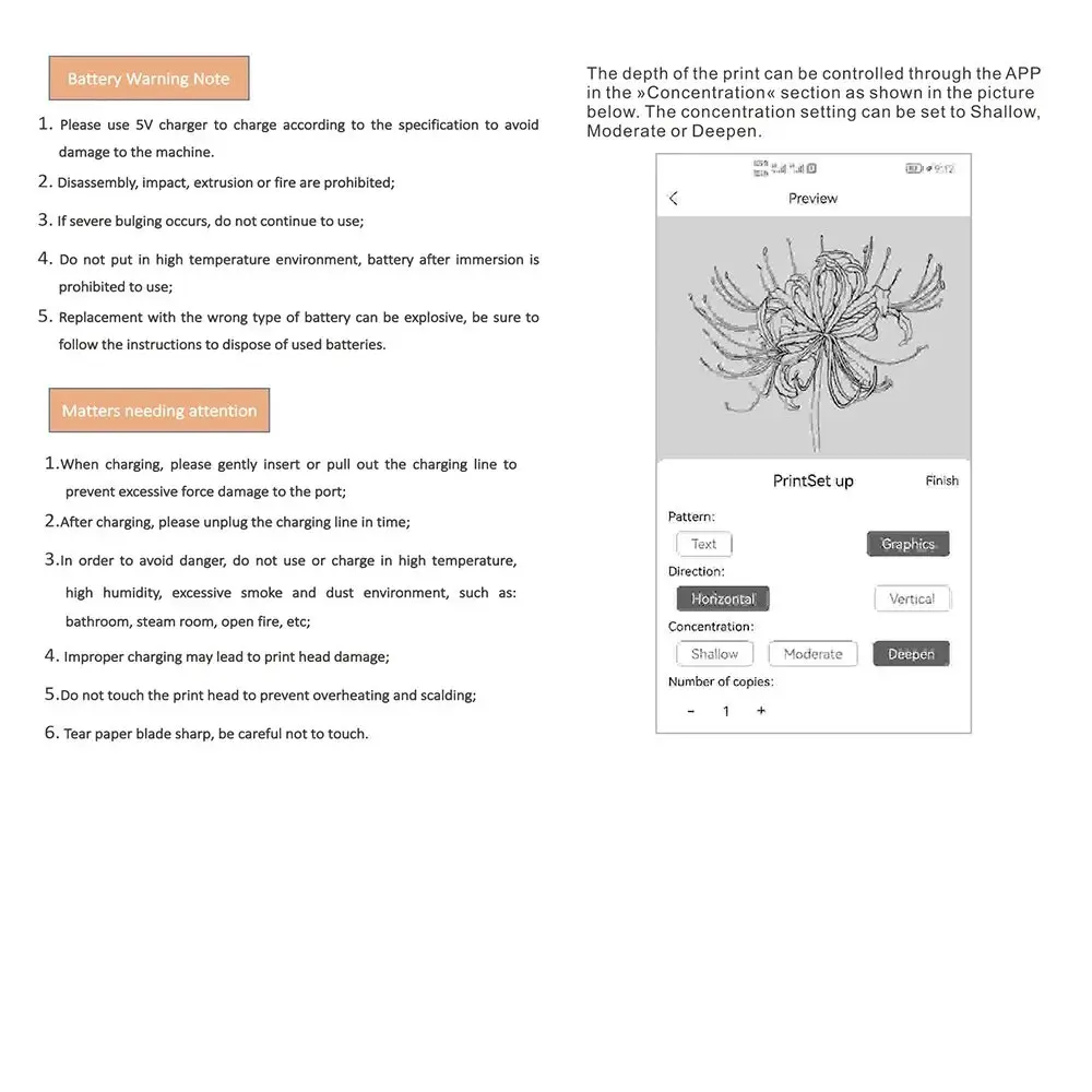 La profundidad de la impresión se puede controlar a través de la APP en la sección de concentración como se muestra en la imagen a continuación. El Ajuste de concentración se puede establecer en Superficial, Moderado o Profundizar.