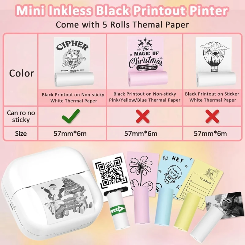 Esta mini impresora de pegatinas de bolsillo mejorada viene con dos rollos de papel blanco, tres rollos de papel de colores (azul, rosa, amarillo) y un rollo de papel autoadhesivo.Puede utilizar tijeras para cortar la salida impresa en etiquetas de cualquier forma y tamaño.El tamaño del papel de la impresora es 57 x 26 mm (ancho x diámetro)
