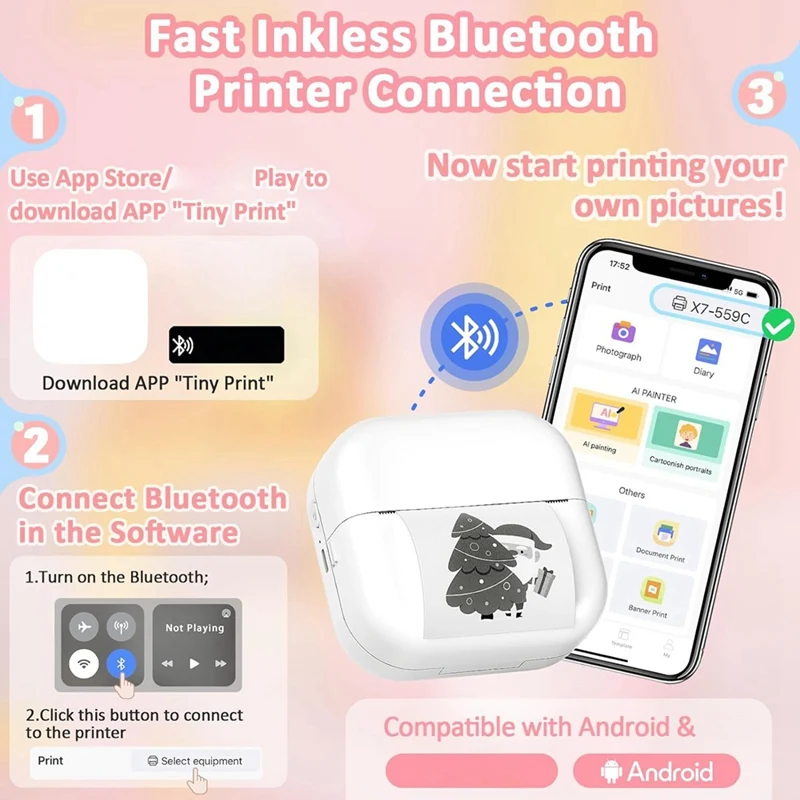 Siga estos dos pasos: el primer paso es buscar y descargar la aplicación "Tiny Print" en App Store o buscar en Google.El segundo paso es presionar el interruptor de la impresora durante mucho tiempo, la luz del oso parpadea en verde, encienda el dispositivo Bluetooth del teléfono, abra la aplicación "Mini Impresión", luego haga clic en "Conectar", actualizar y luego haga clic en "x7" para conectarse.Esta mini impresora es compatible con iOS+Android.