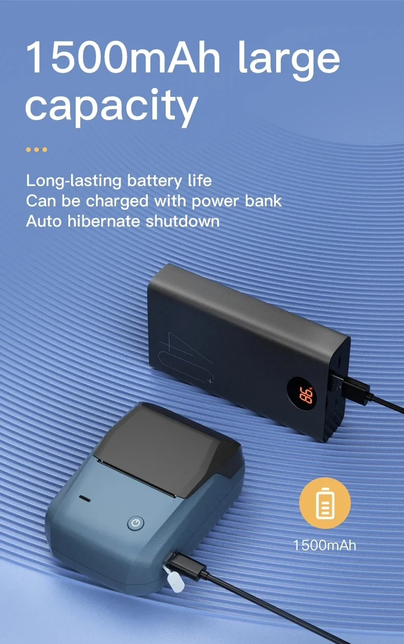 Gran duración de la batería:Viene con una batería de litio de 1500 mAh para una impresión cómoda y rápida.La carga única puede soportar 4 horas de trabajo, no es necesario comprar baterías. La impresora de etiquetas se apagará automáticamente cuando se detenga durante 15 minutos para ahorrar energía.