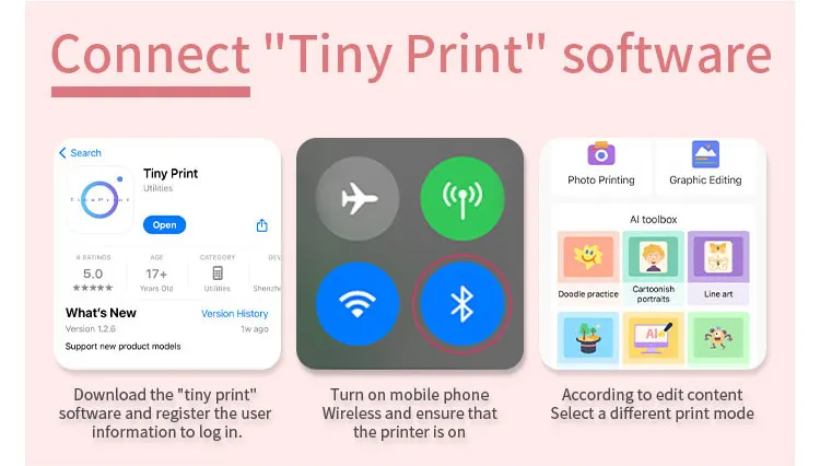 Funciones masivas, continuamente actualizadoBuscar y descargar la aplicación "Tiny Print" para conectarse a la impresora