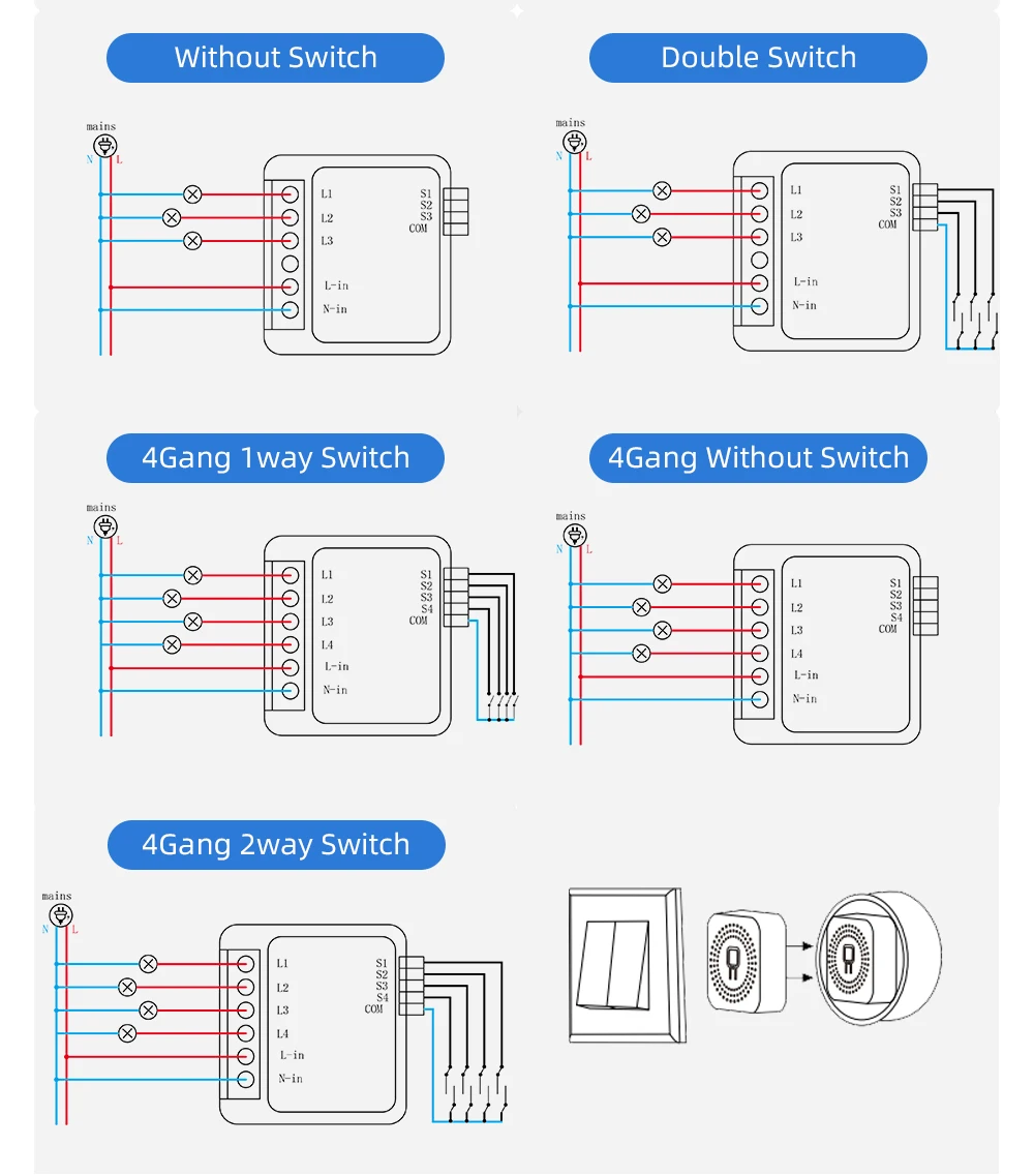 [Tamaño Mini, fácil de instalar]-El cuerpo de tamaño ultra mini puede ocultarse en la caja de interruptores tradicional fácilmente, inteligente su hogar sin cambiar la decoración. También es fácil de instalar, gran artículo para el usuario de bricolaje. (Nota: compatible con interruptor basculante y táctil, pero no compatible con interruptor de reinicio).