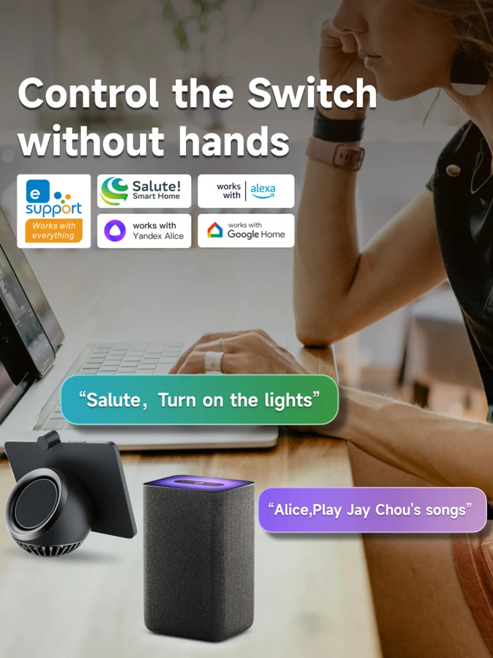 2. Pida a los dispositivos que se enciendan/apaguen con solo un comando de voz. Funciona con Alexa, Google. (El control de voz Alice and Salute requiere conexión a la puerta de enlace eWeLink ZigBee)