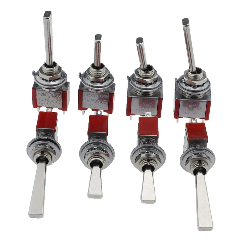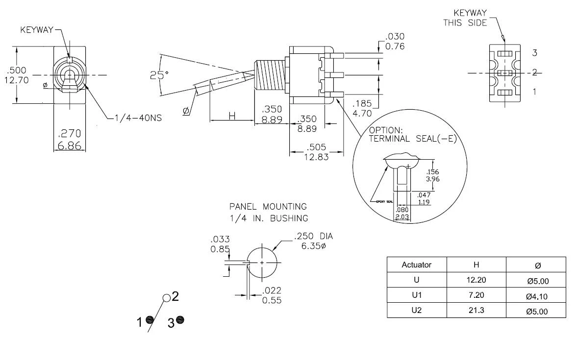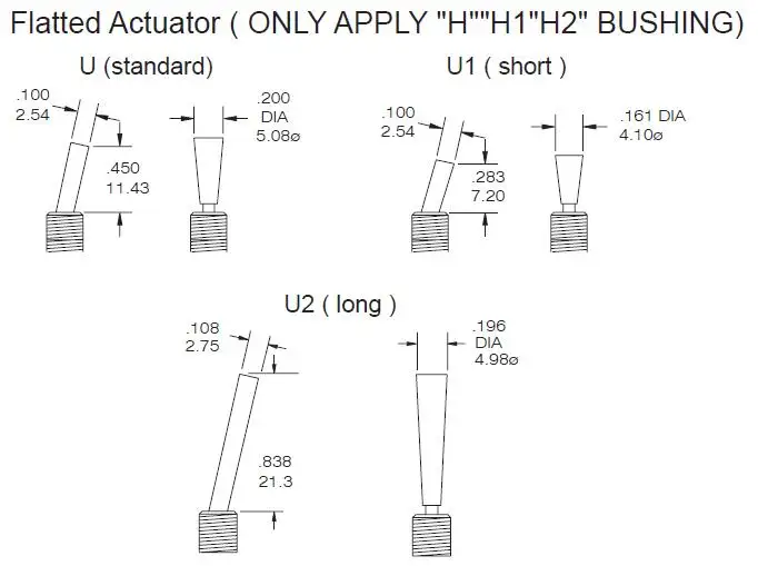 Tipo: Mini interruptor de palanca con palanca plana serie T80-TDiámetro de montaje: 6,35 mm (rosca en pulgadas 1/4-40 UNS)Conexión: soldaduraClasificación de contacto: 5A a 125 VCA o 28 VCCVida eléctrica: 50.000 ciclos de cierre y arranque a plena cargaResistencia de contacto: 10 mΩ máx.inicial a 2-4 VCC, 100 mAResistencia de aislamiento: 1.000 MΩ min.Fuerza dieléctrica: 1.500 V RMS al nivel del mar.Temperatura de funcionamiento: -30°C a 85°CPalanca plana estándar (palanca U)Modelo:T8013-U ON-ON 3Pin SPDT (posición fija)T8013A-U ON-MOM 3Pin SPDT momentáneo (retorno automático)T8014-U ON-OFF-ON 3Pin SPDT (posición fija)T8014A-U MOM-OFF-MOM 3Pin SPDT momentáneo (retorno automático)T8014B-U ON-OFF-MOM 3Pin SPDT Un lado momentáneo (posición ON fija, retorno de posición MOM)Palanca plana larga (palanca U2)Modelo:T8013-U2 ON-ON 3Pin SPDT (posición fija)T8013A-U2 ON-MOM 3Pin SPDT momentáneo (retorno automático)T8014-U2 ON-OFF-ON 3Pin SPDT (posición fija)T8014A-U2 MOM-OFF-MOM 3Pin SPDT momentáneo (retorno automático)T8014B-U2 ON-OFF-MOM 3Pin SPDT Un lado momentáneo (posición ON fija, retorno de posición MOM)