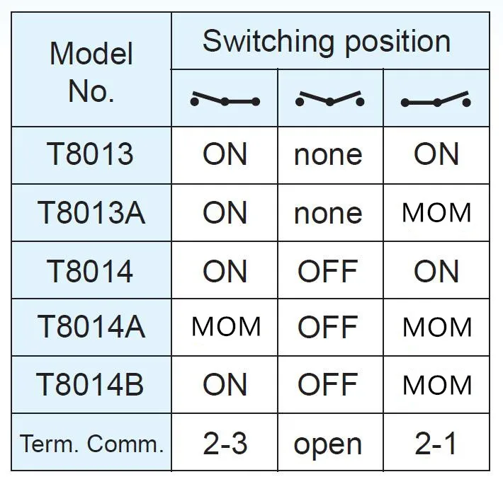 Tipo: Mini interruptor de palanca con palanca plana serie T80-TDiámetro de montaje: 6,35 mm (rosca en pulgadas 1/4-40 UNS)Conexión: soldaduraClasificación de contacto: 5A a 125 VCA o 28 VCCVida eléctrica: 50.000 ciclos de cierre y arranque a plena cargaResistencia de contacto: 10 mΩ máx.inicial a 2-4 VCC, 100 mAResistencia de aislamiento: 1.000 MΩ min.Fuerza dieléctrica: 1.500 V RMS al nivel del mar.Temperatura de funcionamiento: -30°C a 85°CPalanca plana estándar (palanca U)Modelo:T8013-U ON-ON 3Pin SPDT (posición fija)T8013A-U ON-MOM 3Pin SPDT momentáneo (retorno automático)T8014-U ON-OFF-ON 3Pin SPDT (posición fija)T8014A-U MOM-OFF-MOM 3Pin SPDT momentáneo (retorno automático)T8014B-U ON-OFF-MOM 3Pin SPDT Un lado momentáneo (posición ON fija, retorno de posición MOM)Palanca plana larga (palanca U2)Modelo:T8013-U2 ON-ON 3Pin SPDT (posición fija)T8013A-U2 ON-MOM 3Pin SPDT momentáneo (retorno automático)T8014-U2 ON-OFF-ON 3Pin SPDT (posición fija)T8014A-U2 MOM-OFF-MOM 3Pin SPDT momentáneo (retorno automático)T8014B-U2 ON-OFF-MOM 3Pin SPDT Un lado momentáneo (posición ON fija, retorno de posición MOM)