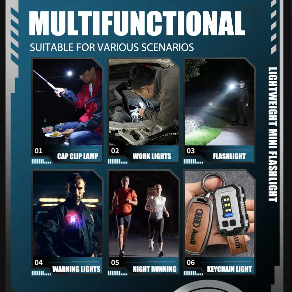 4. FÁCIL DE USAR: Haga doble clic para abrir el modo de iluminación. La luz principal de la mini linterna tiene cuatro modos de brillo diferentes: luz fuerte, luz media, luz débil, modo de ahorro de energía y pulsación larga para apagarla. Mantenga presionadas las luces laterales para encenderlas, suéltelas para apagarlas. Haga doble clic para encender la luz lateral, haga clic para cambiar entre luz púrpura/luz roja/rojo intermitente/rojo azul intermitente y presione prolongadamente para apagar