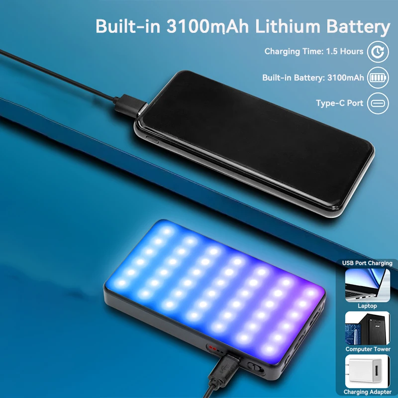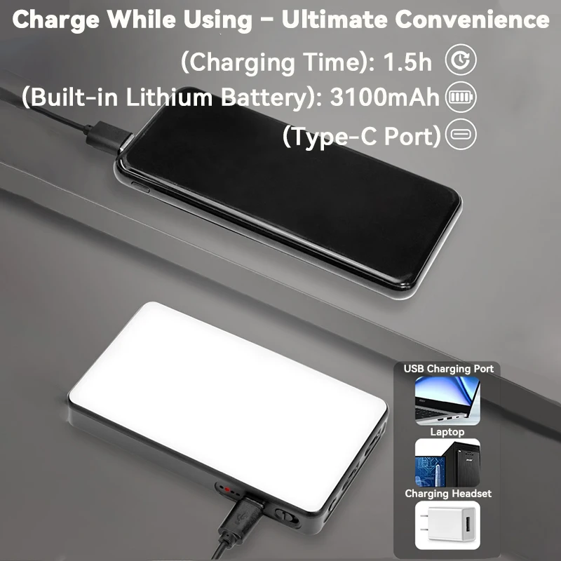 Batería de litio incorporada de 3100 mAh, se carga en solo 1,5 horas, con 2 horas con brillo máximo y 11 horas con brillo mínimo, perfecta para tomas prolongadas.