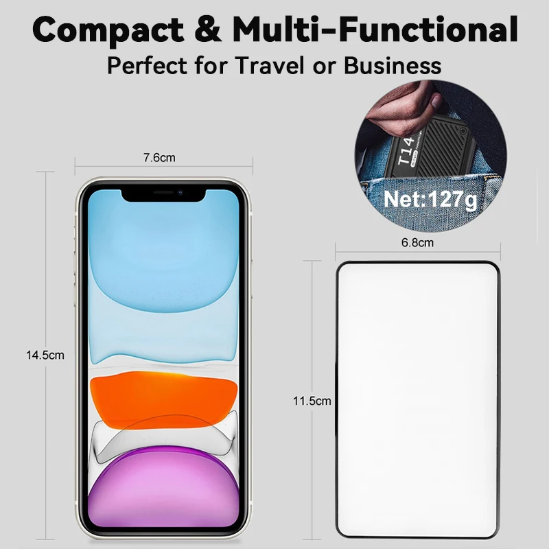 Con un peso de solo 127 g y un grosor de 11,5 × 6,8 × 1,6 cm, esta mini luz es perfecta para creadores en movimiento, ya sea que viaje o trabaje en espacios reducidos.
