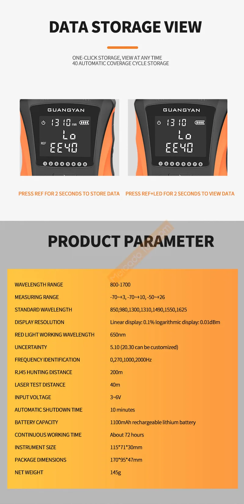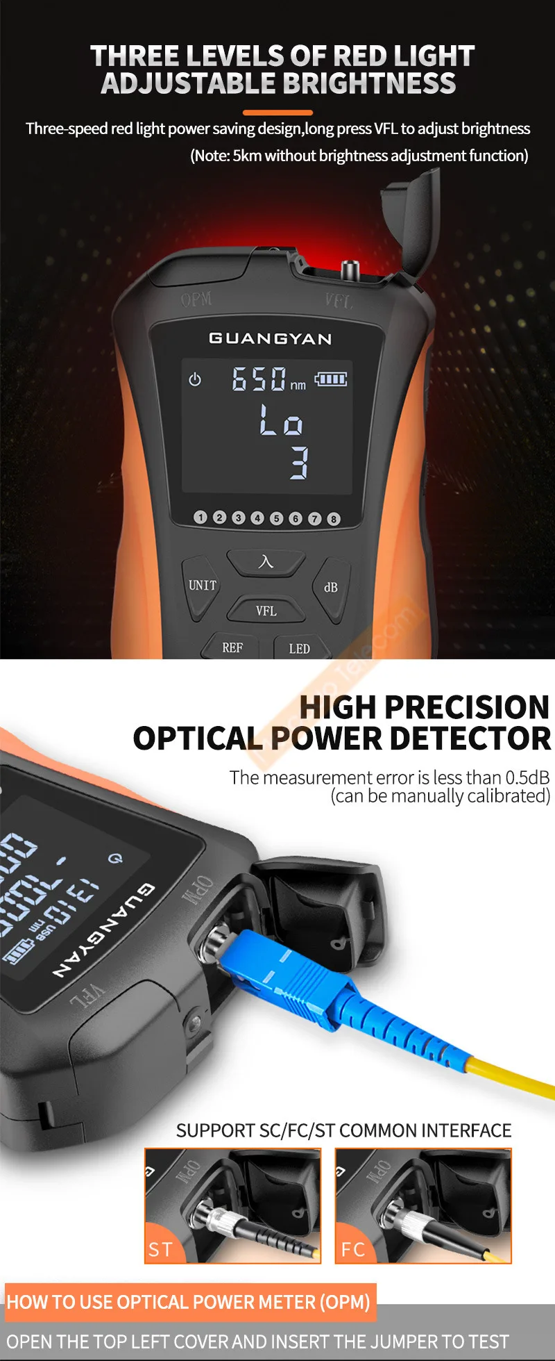 2. Detector de potencia óptica de alta precisión: el error de medición es inferior a 0,5 dB (se puede calibrar manualmente). Admite interfaz común SC \ FC \ ST