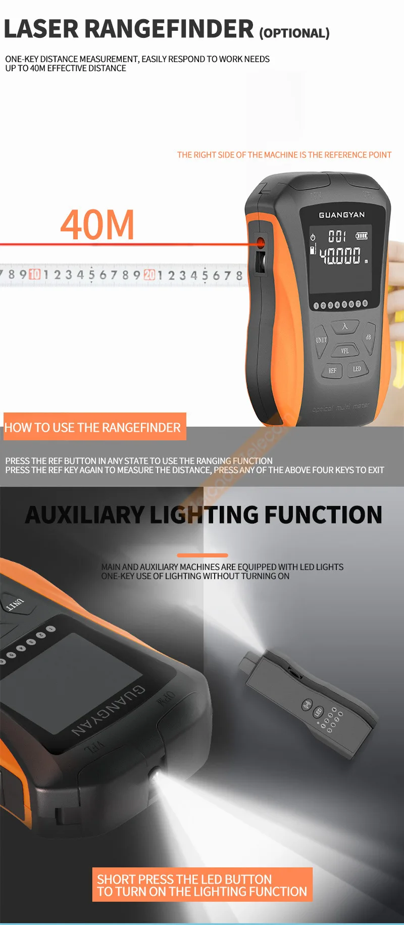 Esta máquina todo en uno integra el medidor de potencia óptica, el lápiz de luz roja, la función de alineación, la iluminación LED y otras funciones en una, lo cual es muy práctico.
