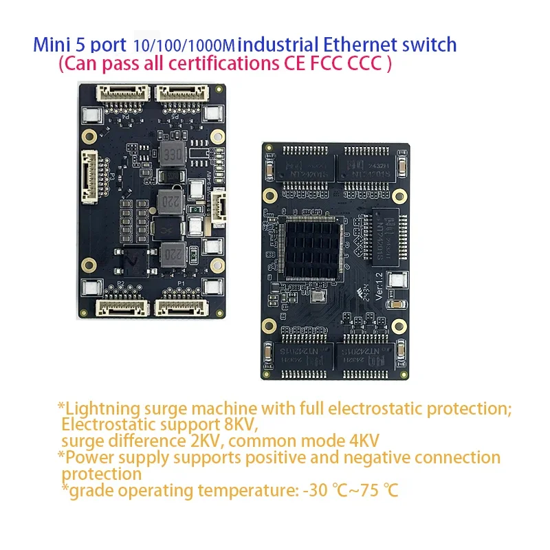 Este es un mini Módulo de conmutador Ethernet no administrado Gigabit diseñado específicamente para entornos industriales. Proporcionamos 5 enchufes adaptativos 10/100/1000M Ethernet bloqueables, diseñados estrictamente de acuerdo con el rango de temperatura de trabajo de-30 ℃ ~ 75 ℃. Seleccionamos componentes de grado industrial y utilizamos disipación de calor natural para garantizar que el equipo pueda funcionar de manera estable durante mucho tiempo dentro de este rango de temperatura, cumpliendo con varios entornos hostiles.