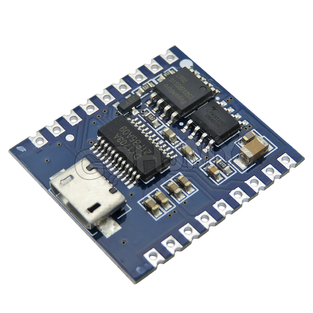 Archivos de audio de almacenamiento flash integrados de 32 M de bits (4 MBytes), archivos de audio de copia USB directamente, reproducción de canciones específicas, el grosor de la placa es de 0,8 mm y el orificio del sello puede soldar, compatible con un cabezal de clavija de 2,54 mm.