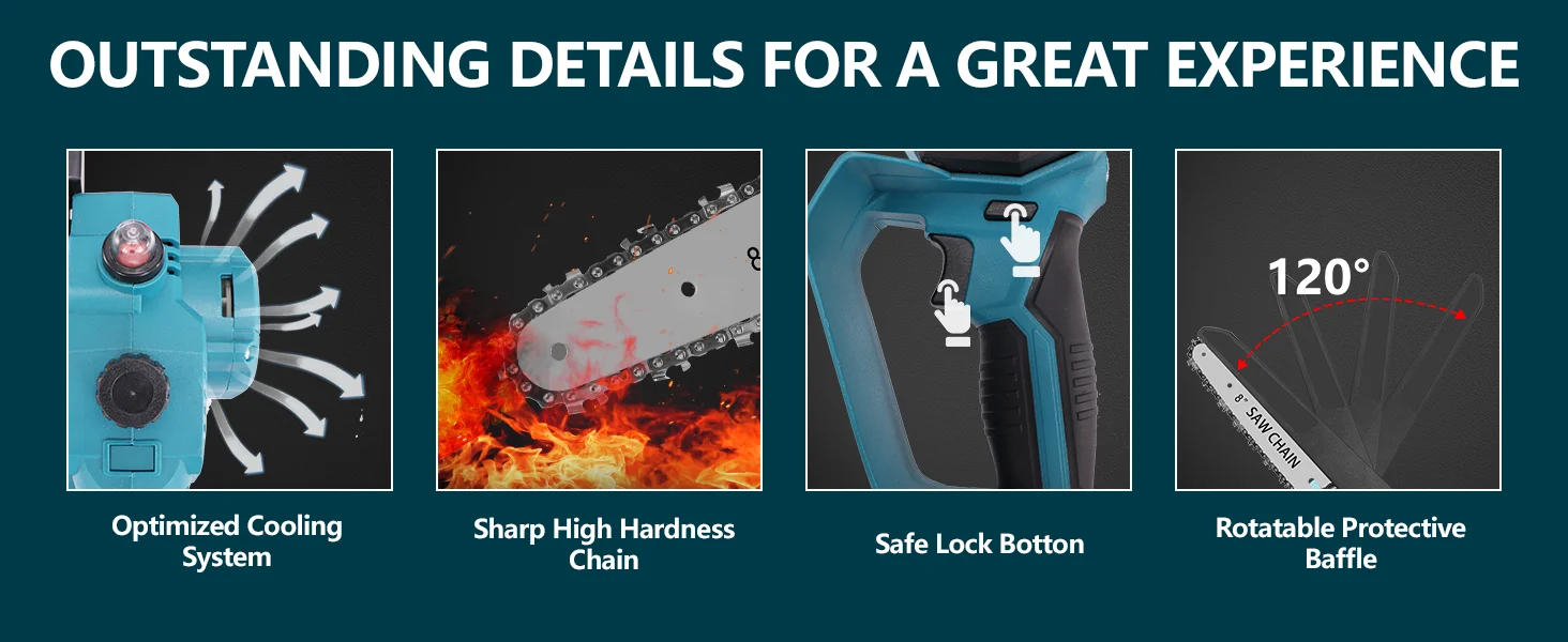 Motor de alto rendimiento: un motor de cobre puro de 850 W impulsa la cadena a 39 pies/s y ofrece cortes más rápidos y eficientes.El motor se calienta y el sistema de protección se agarra y deja de funcionar.Sólo necesitas dejarlo enfriar durante diez minutos para volver a funcionar.