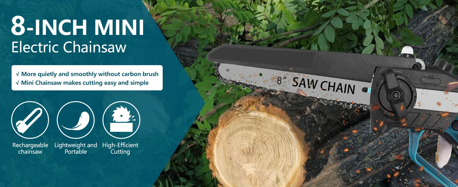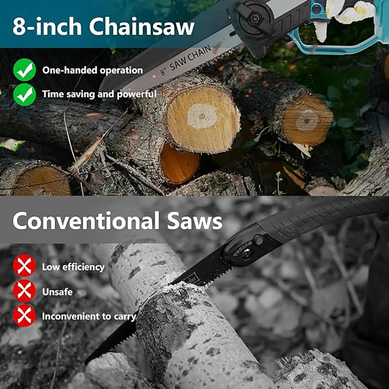 Mini motosierra inalámbrica de 8 pulgadas: carcasa liviana de la motosierra con batería, fácil de transportar.Al menos un 80% más eficiente al cortar, pelar y podar madera.Operación con una sola mano, ramas de 0 ~ 18 cm cortadas inmediatamente.Permite una instalación rápida y sencilla en un minuto, no requiere destornillador.
