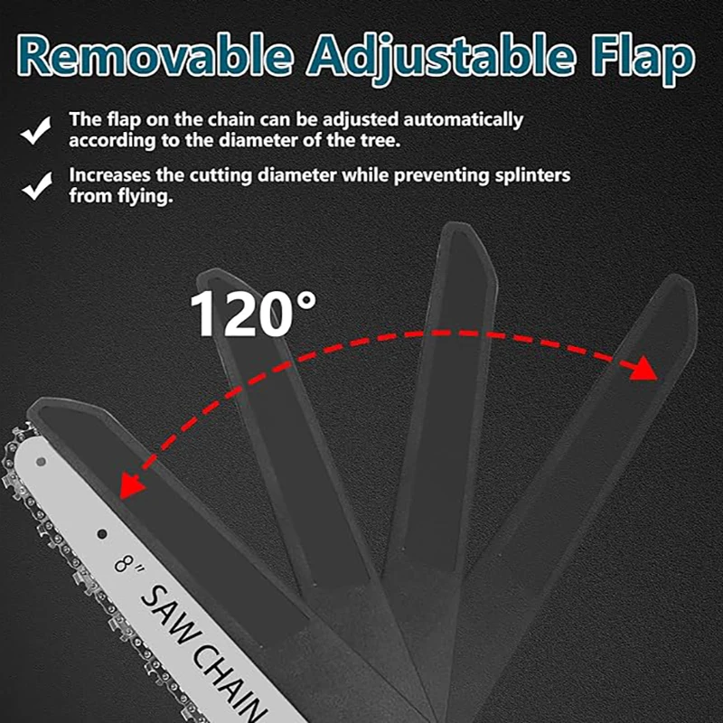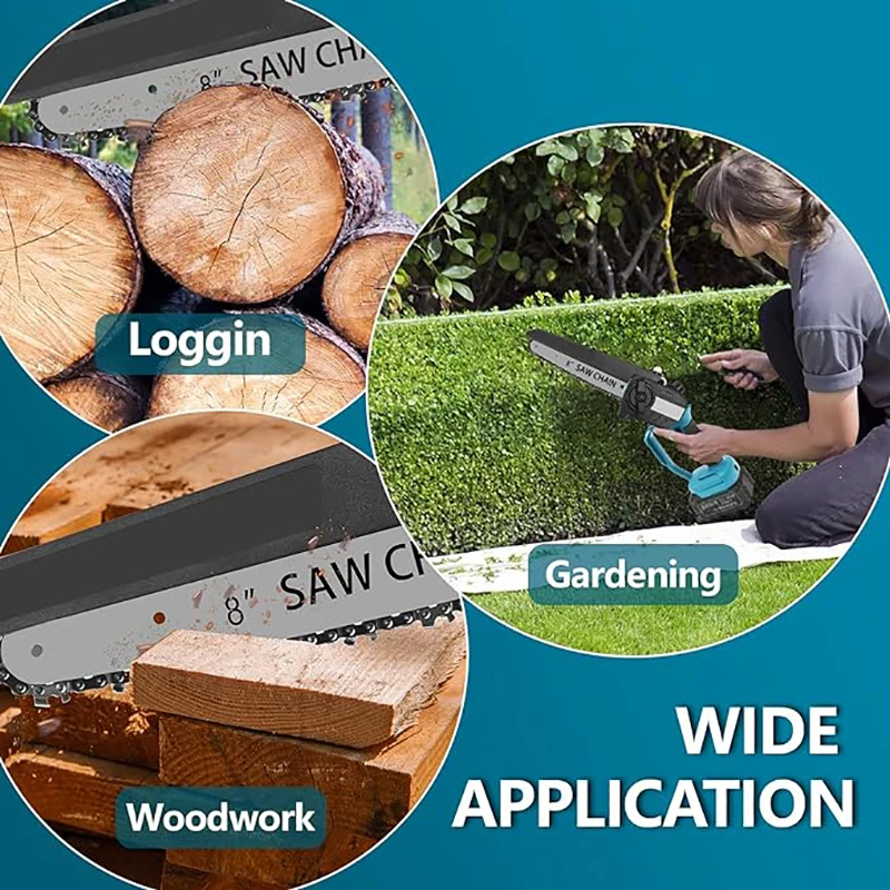 Cadena de aleación endurecida: la mini motosierra utiliza una cadena endurecida, la cadena está hecha de acero 65 Mn con alta resistencia, dureza, elasticidad y resistencia al desgaste, mientras que el proceso de enfriamiento profundo mejora aún más su rendimiento para garantizar cortes limpios y suaves.