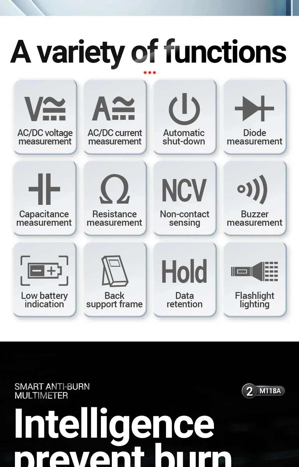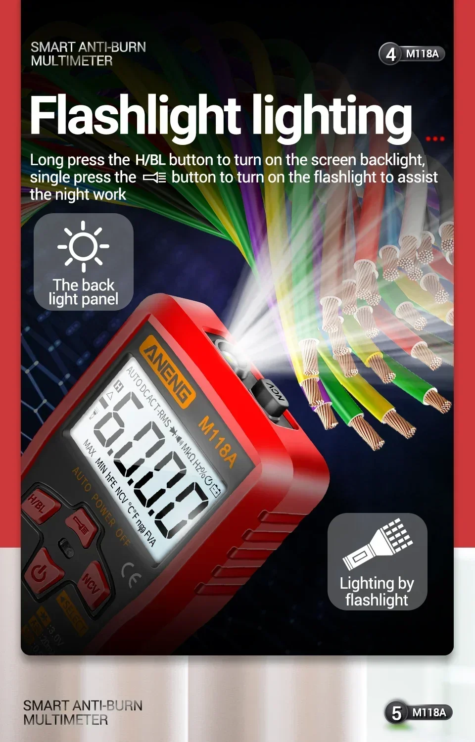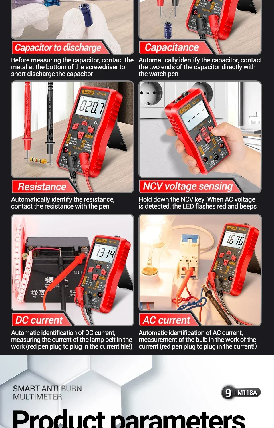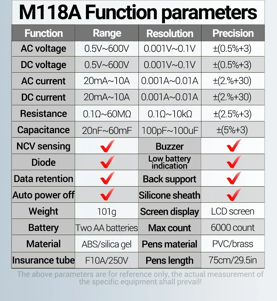 Comprar Mini multímetro Digital ANENG, 6000 recuentos, medidor automático de voltaje CC/CA, medidor de Tranistor, linterna de retención de datos NCV M118A