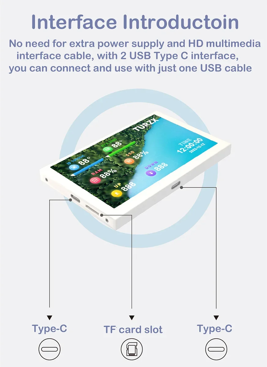 Hecho de gran carcasa de metal. Ángulo de visión: IPS vista completa. Interfaz: USB-TypeC