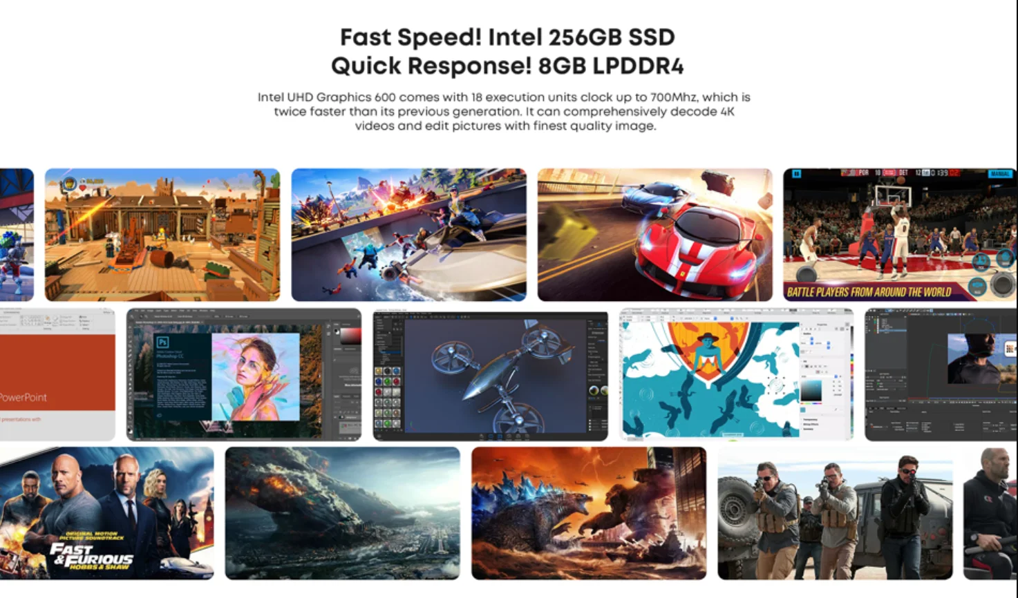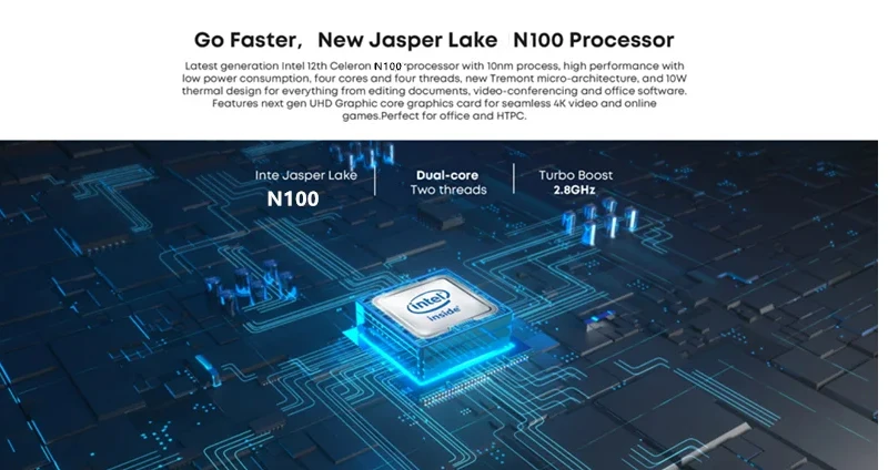 Procesador Intel Celeron N100 de última generación con proceso de 10nm, alto rendimiento sin consumo de energía, cuatro núcleos y cuatro hilos, nuevo diseño térmico Tremont 10W para todo, desde editar documentos, videoconferencia y software de oficina. Cuenta con tarjeta gráfica de núcleo gráfico UHD de próxima generación para vídeos 4K y juegos en línea sin problemas. Perfecto para oficina y HTPC