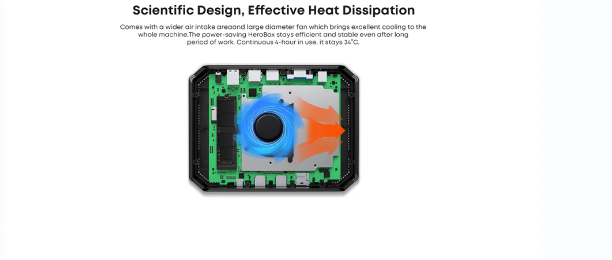 Viene con un área de entrada de aire más amplia y un ventilador de gran diámetro que brinda una excelente refrigeración a toda la máquina. La HeroBox de ahorro de energía se mantiene eficiente y estable incluso después de un largo período de trabajo. 4 horas de uso continuo, se mantiene 34 * C.