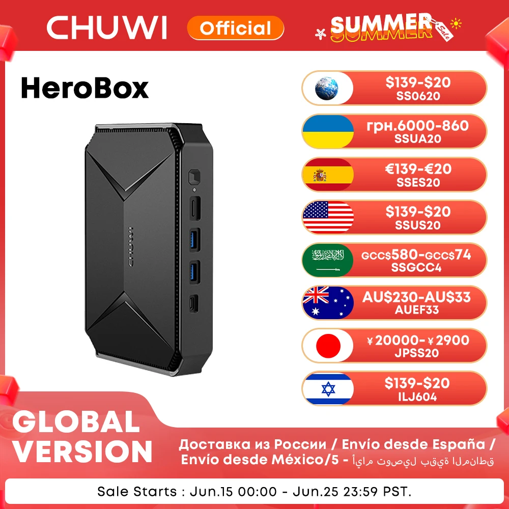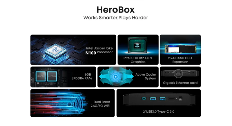 Contenido del paquete1 * Mini PC1*12V 2A DC cargador/cable1 soporte VESA1 * Manual de usuario1 * Tarjeta de garantíaComprar Mini PC CHUWI HeroBox Intel Celeron N100 CPU de cuatro núcleos Windows 11 OS 8GB LPDDR4 256GB SSD ordenador de escritorio Wifi de doble banda