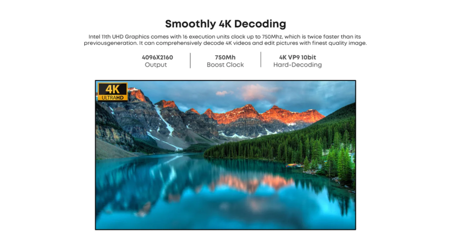 Intel 11th UHD Graphics Viene con 16 unidades de ejecución de reloj de hasta 750Mhz, que es dos veces más rápido que su generación anterior. Puede decodificar vídeos 4K de forma integral y editar imágenes con la mejor calidad de imagen