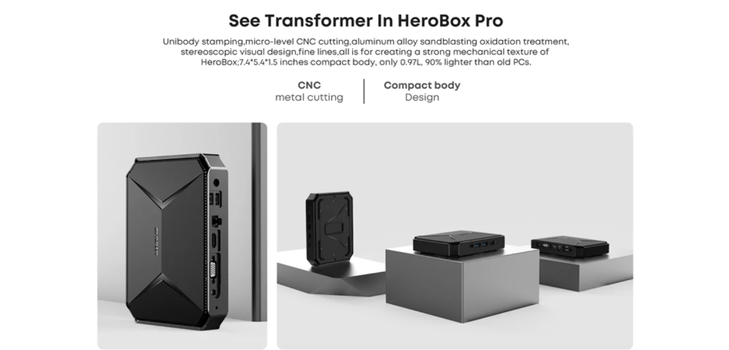 Estampado unibody. Corte CNC de nivel micro. Tratamiento de oxidación con chorro de arena de aleación de aluminio, diseño visual estereoscópico, líneas finas, todo para crear una fuerte textura mecánica de HeroBox: cuerpo compacto de 7,4 "5. 41,5 pulgadas, solo 0.97L, 90% más ligero que las PC antiguas.