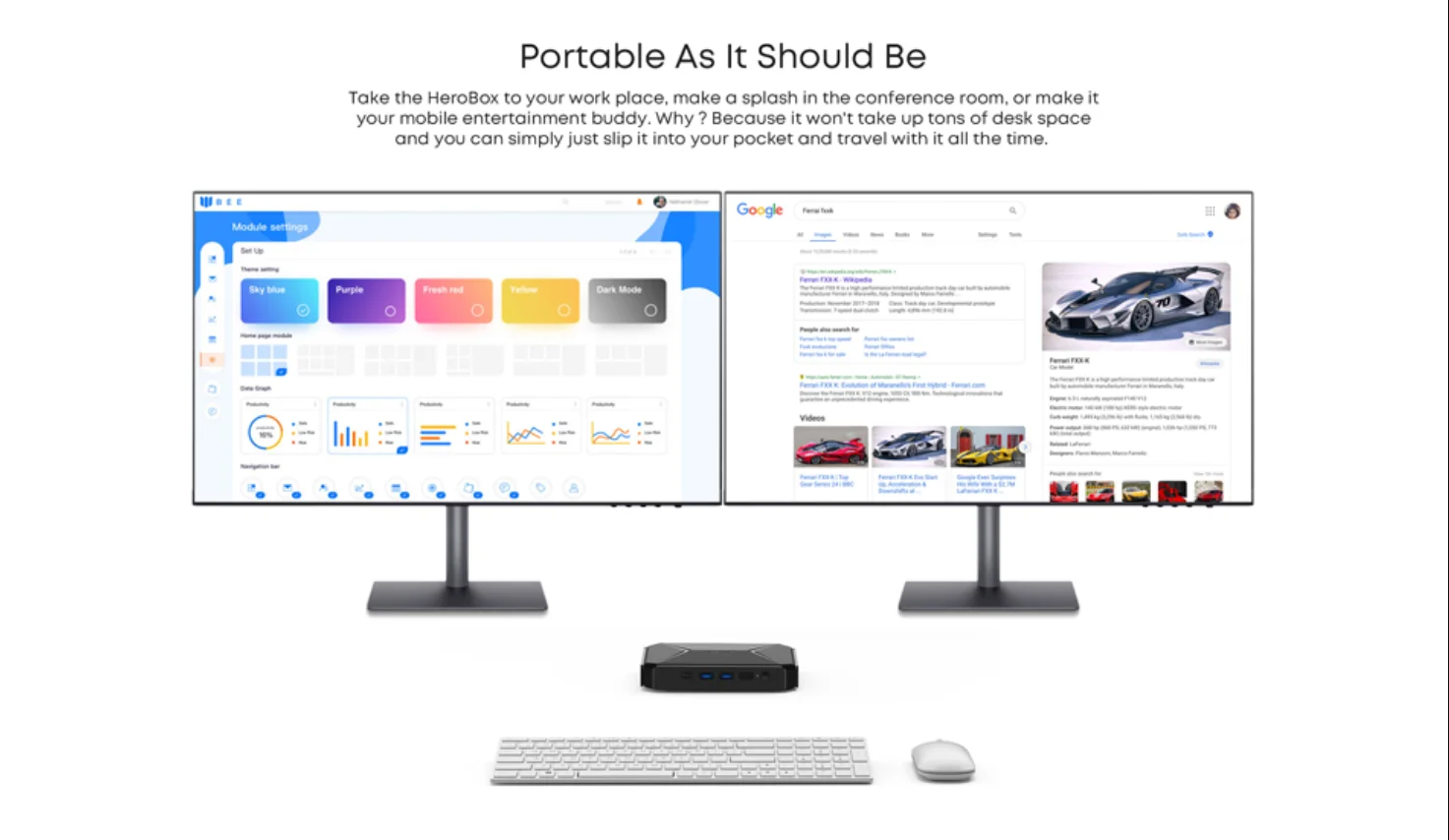 Lleve el HeroBox a su lugar de trabajo, dé un paseo en la sala de conferencias o conviértase en su compañero de entretenimiento móvil. ¿Por qué? Porque no ocupará mucho espacio en el escritorio y simplemente puede meterlo en su bolsillo y viajar con él todo el tiempo.