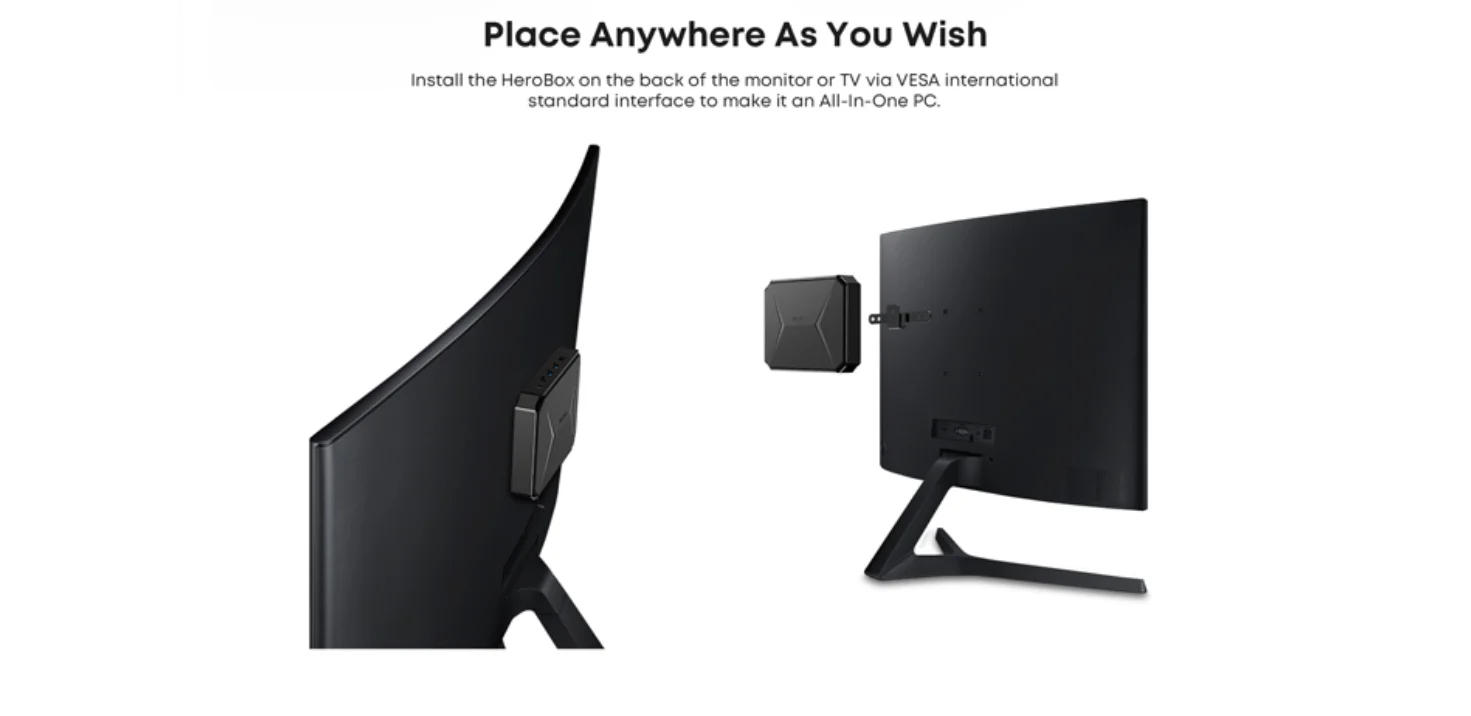 Instale el HeroBox en la parte posterior del monitor o TV a través de la interfaz estándar internacional VESA para convertirlo en un PC todo en uno.