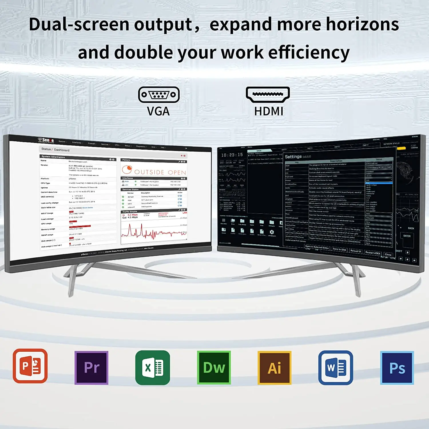 1 x HDMI, 1 x VGA, Admite conexión simultánea de dos monitores