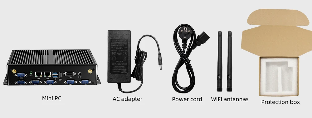 1 mini pc + 1 adaptador de corriente + 2 antenas WIFI