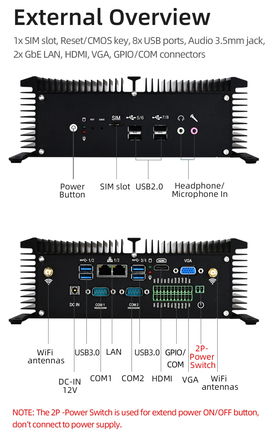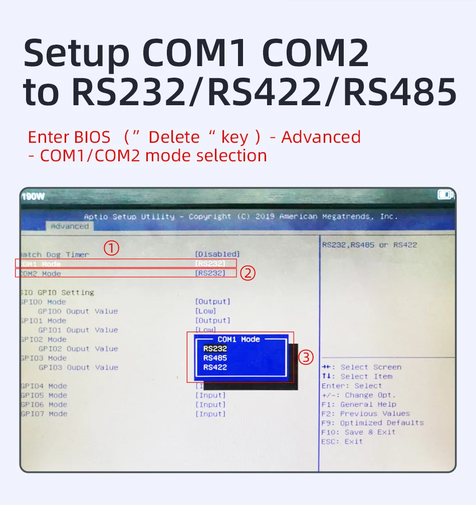 COM1 /COM2: RS232/RS485/RS422 serial ports, adjustable in BIOS
